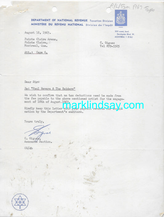 1967 Raiders Canadian Tax Typewritten Documents - Personally Autographed to YOU by Mark