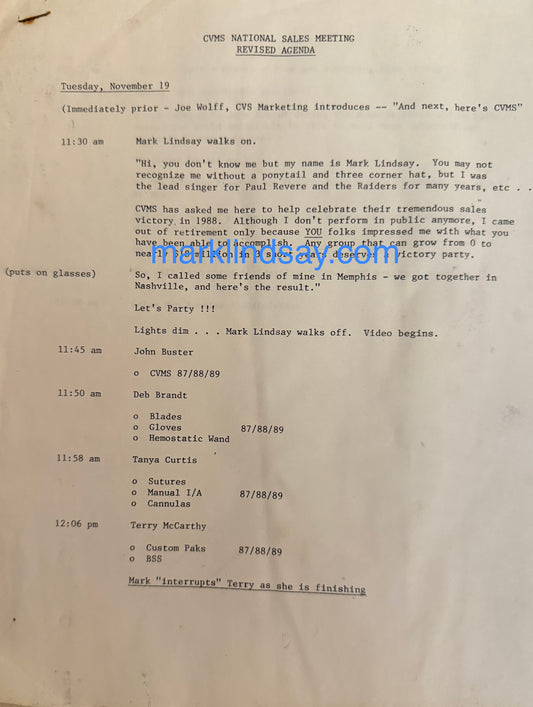 1988 Correspondence/Lyrics/Sheet Music CooperVision Sales Convention (with Future Wife Deb) - Personally Autographed to YOU by Mark Lindsay