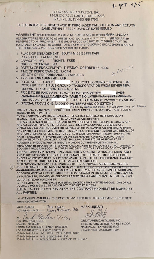 1996 S Mississippi Fair Contract and Clippings, Check Stub - Personally Autographed to YOU by Mark Lindsay