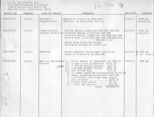 1973 Raiders Instrument Etc Insurance Documents - Personally Autographed to YOU by Mark