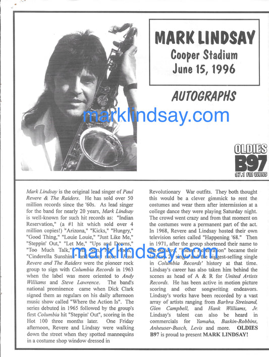 1994 Stage Photo - Mark Lindsay in NW - Personally Autographed to YOU by Mark