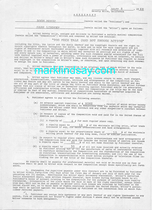 Mark Lindsay Signed Songwriters Contract TOO MUCH TALK Vintage 1968 - Personally Autographed to YOU by Mark