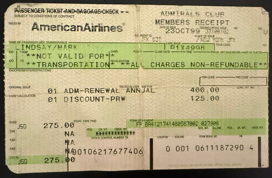 Mark LIndsay American Airlines Admirals Club Personalized Luggage Tag/1999 Receipt - Personally Autographed to YOU by Mark