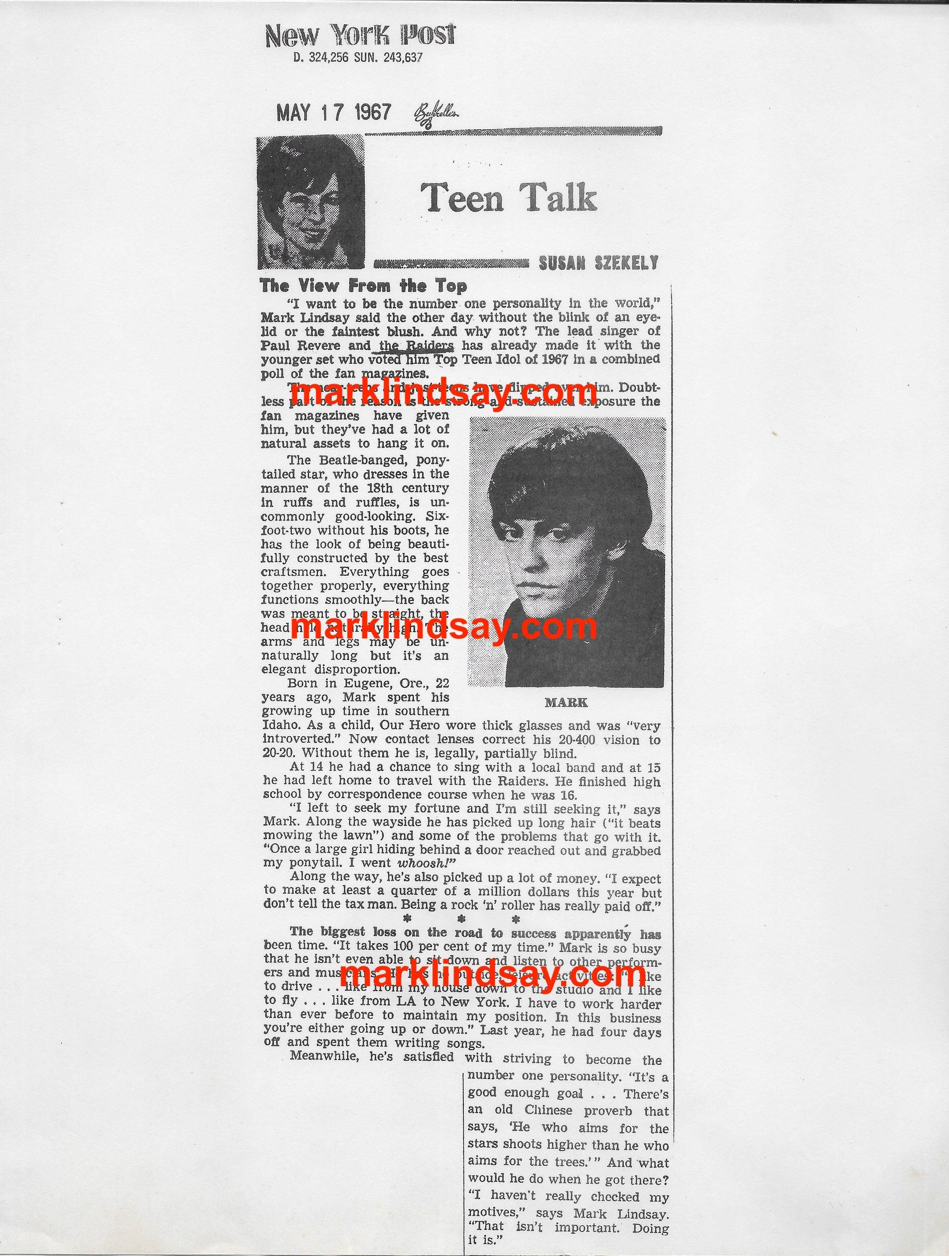 This is an original May 1967 file copy of an interview that supposedly took place with Mark Lindsay by the Teen Talk columnist for the New York Post. To be clear, this copy (8-1/2" x 11") was created and filed in 1967 by the Raiders' publicity clipping service, and is a 56 year old document.