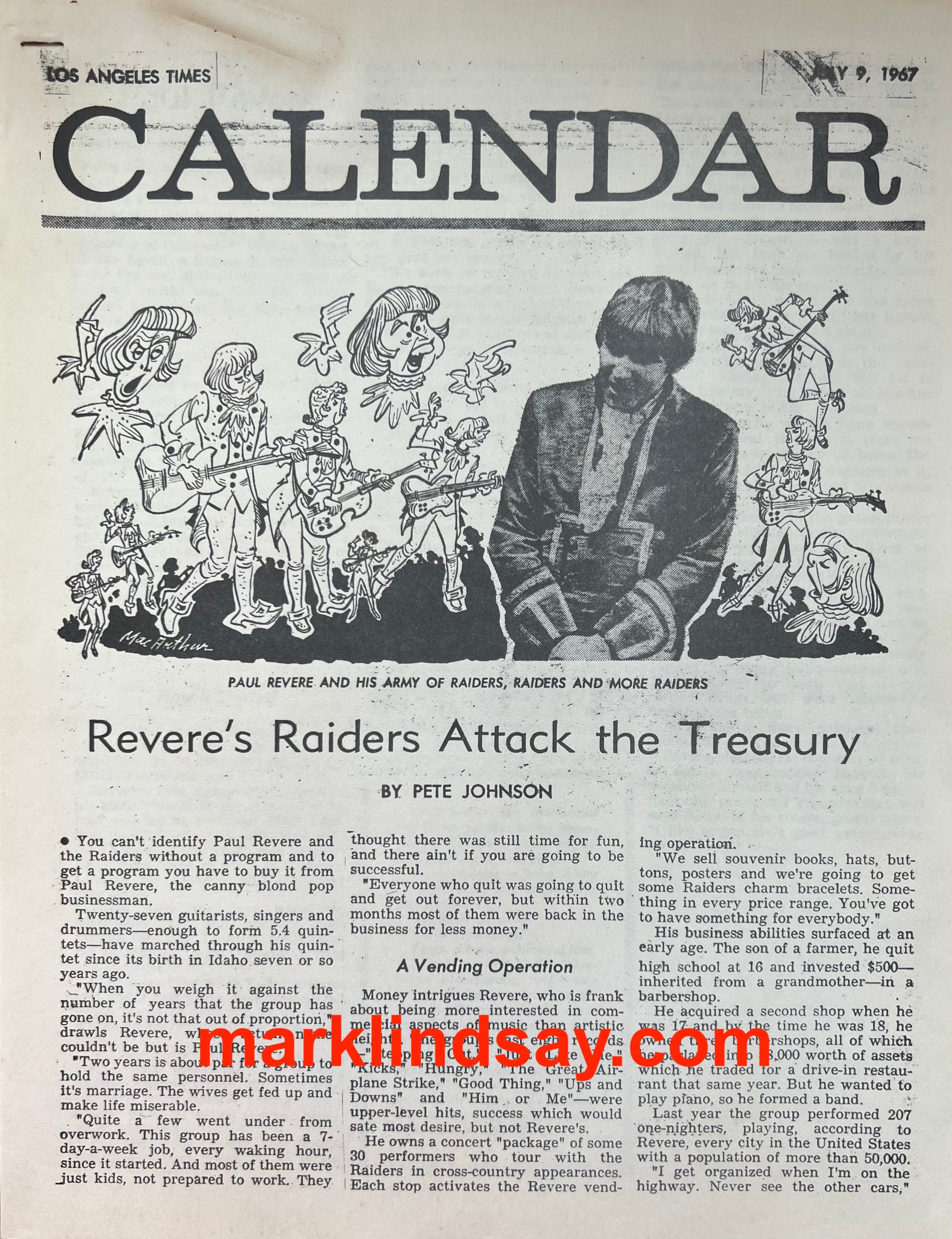 This is an original July 1967 file copy of an interview with Paul Revere on the economics of the Raiders, printed in the L.A. Times Calendar section. To be clear, this copy (2 pages, 8-1/2" x 11") was created and filed in 1967 by the Raiders' publicity clipping service, and is a 56 year old document. It has some marks from being paper clipped.