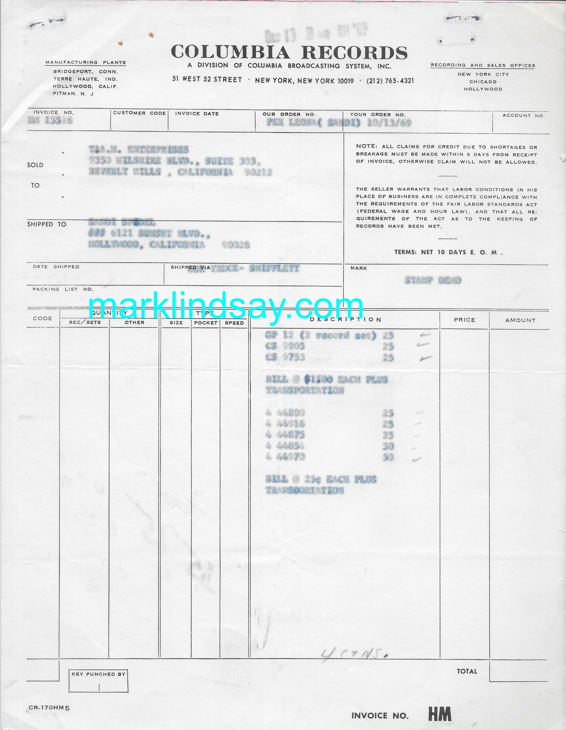 This is original carbon copy of a Columbia Records packing slip included in a 1969 shipment of promo records (Raider albums and 45s) shipped to the Raiders in care of their production company, TAM Enterprises.