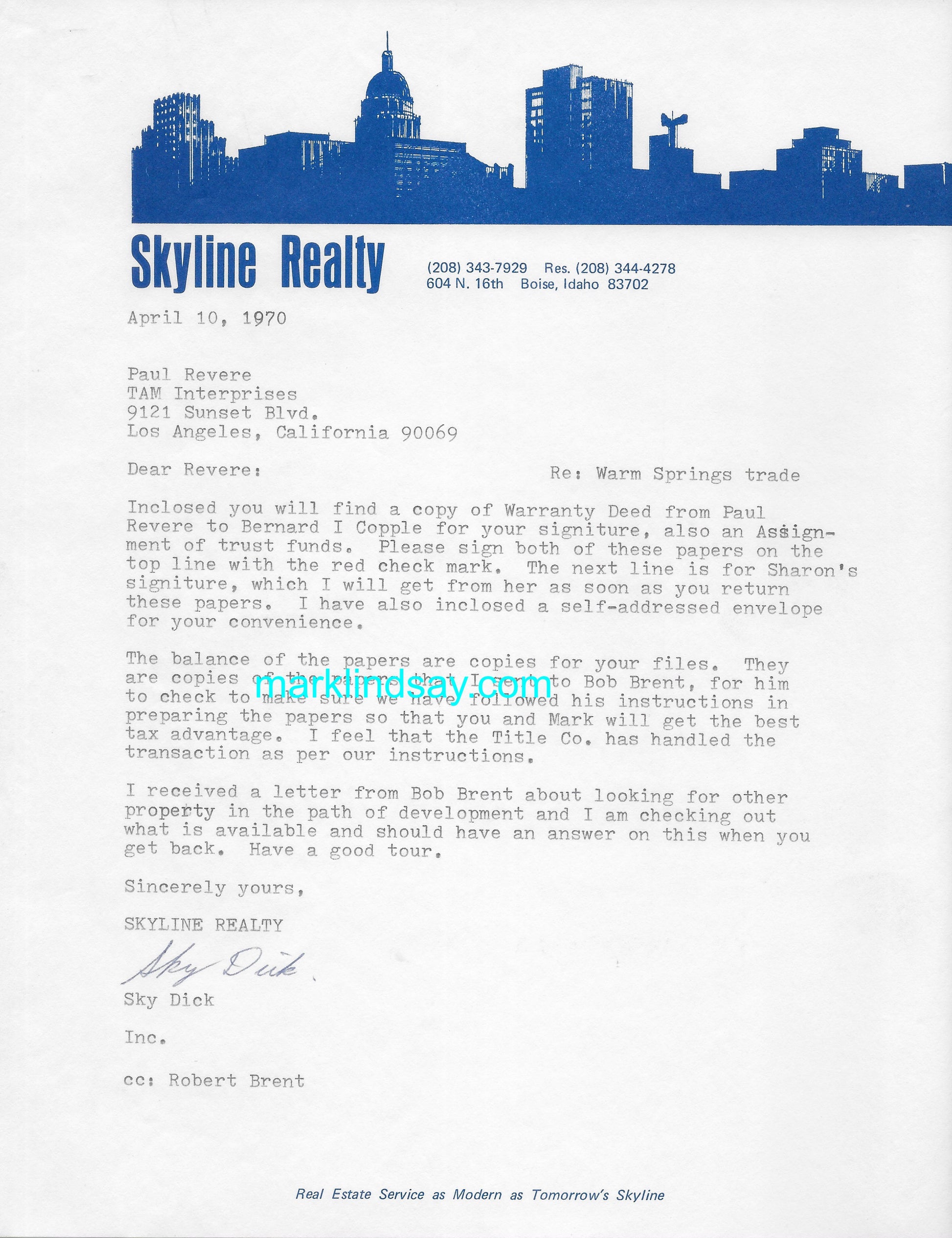 This is an original, vintage letter dated April 10, 1970, written to Paul Revere by his brother and real estate agent Sky Dick, regarding the sale of a piece of land owned by Mark and Paul 50/50 as Revere-Lindsay Investments. That was the partnership they formed in 1968 to invest in real estate in Idaho.