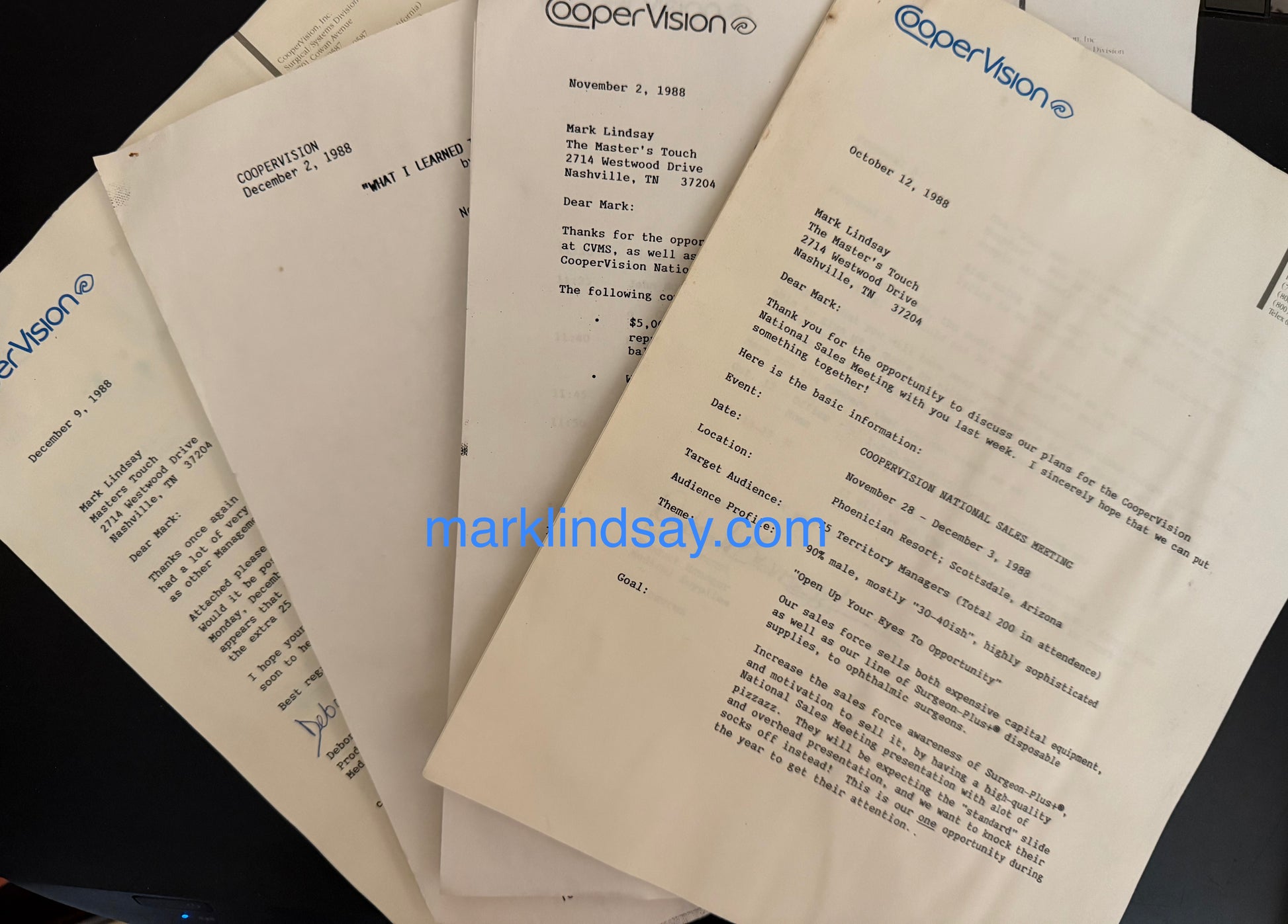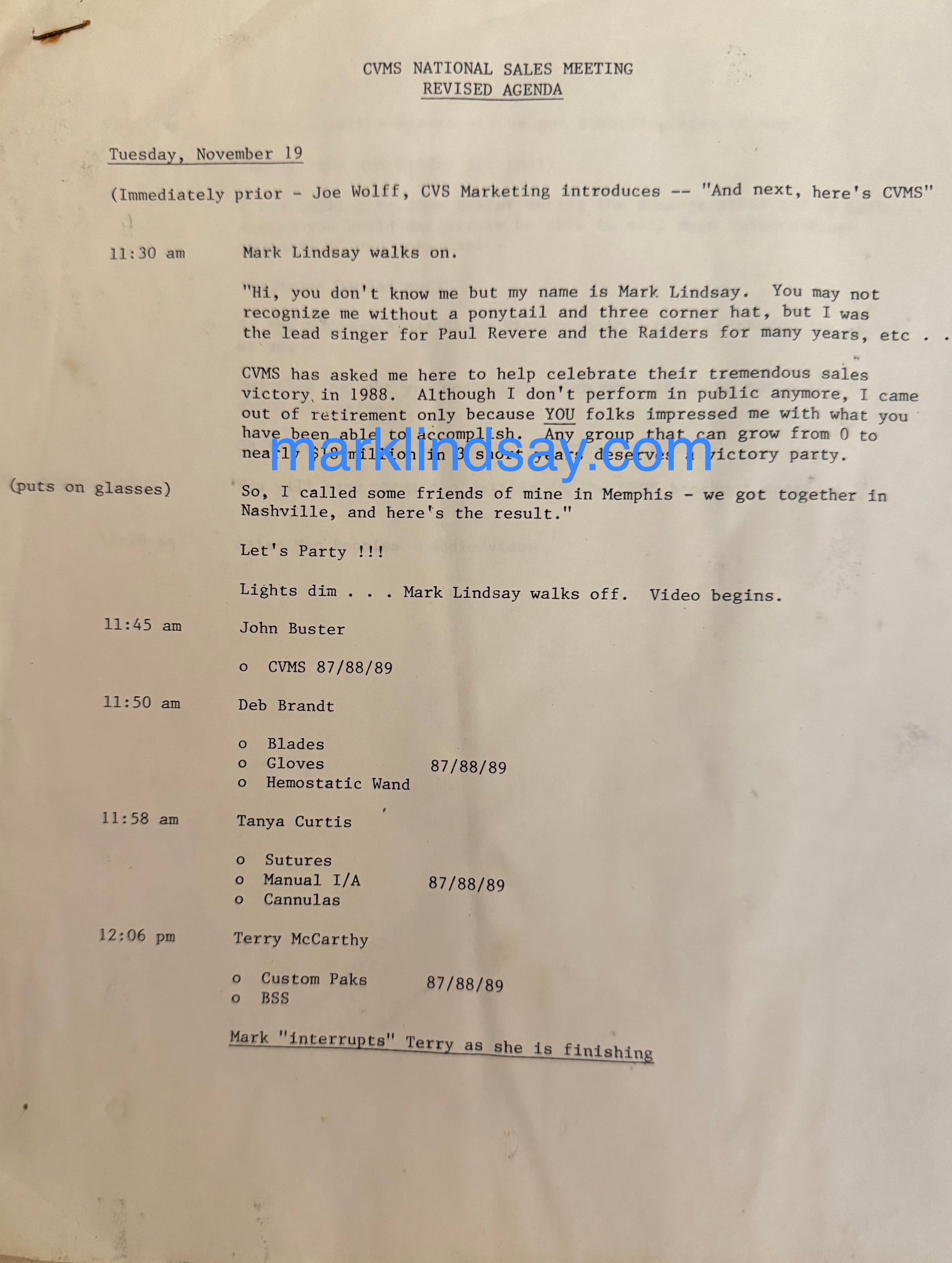 This is a collection of materials for the November 19, 1988 CooperVision National Sales Meeting in Arizona, where Mark Lindsay was a surprise guest and was hired by the company to put together a program and recording, changing the lyrics of Soul Man to "Sales Man (Funky Sales Woman." Mark produced the new song in Memphis with The Memphis Horns. As it happened, his future wife Deb was a product manager for the company and coordinated the meeting with Mark.
