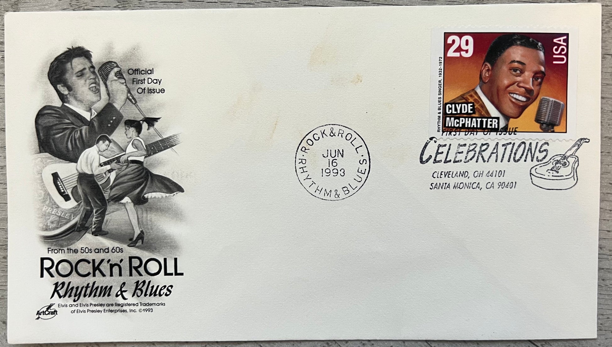 This is a June 16, 1993 First Day Cover with the postage cancellation "Rock & Roll, Rhythm & Blues." It has an engraving of Elvis and a Clyde McPhatter stamp. and measures 3-5/8" x 6-3/8".