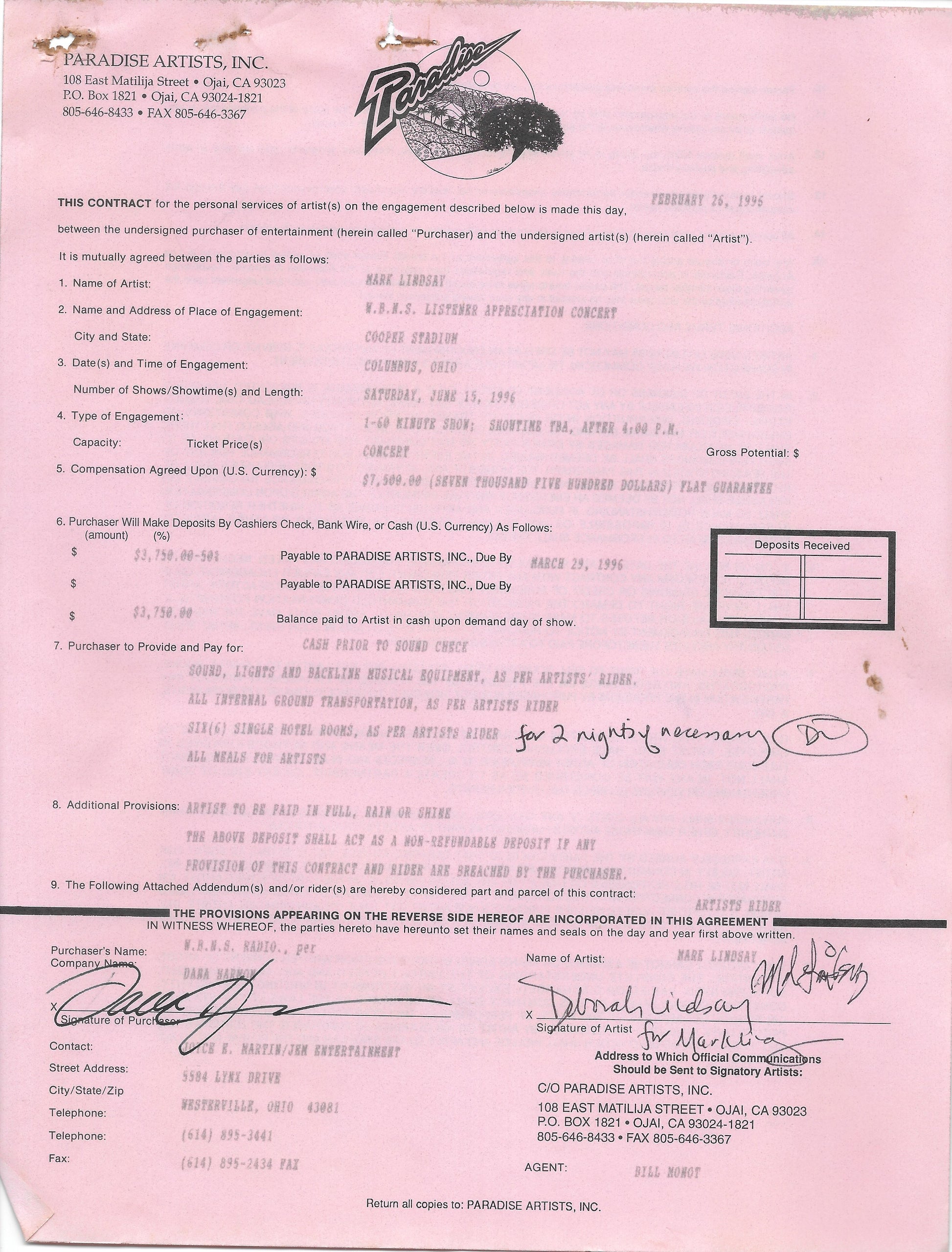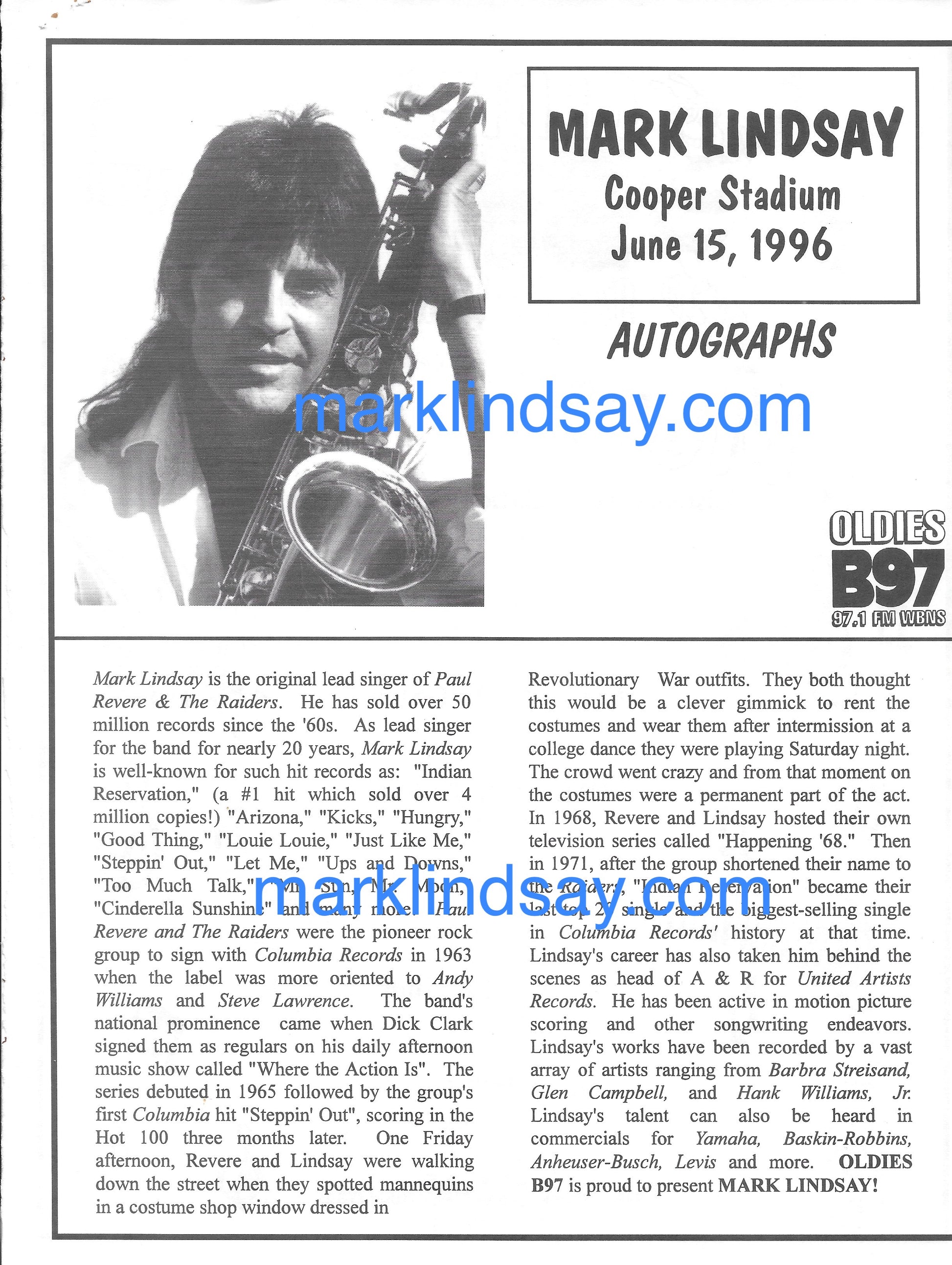This is an ORIGINAL contract for Mark Lindsay to appear at Cooper Stadium in Columbus, Ohio on June 15, 1996, in a concert sponsored by radio station B97. The package also includes 2 pages from the booklet distributed at the show (measures 8-1/2"x11"), an airline receipt, as well as a check stub.