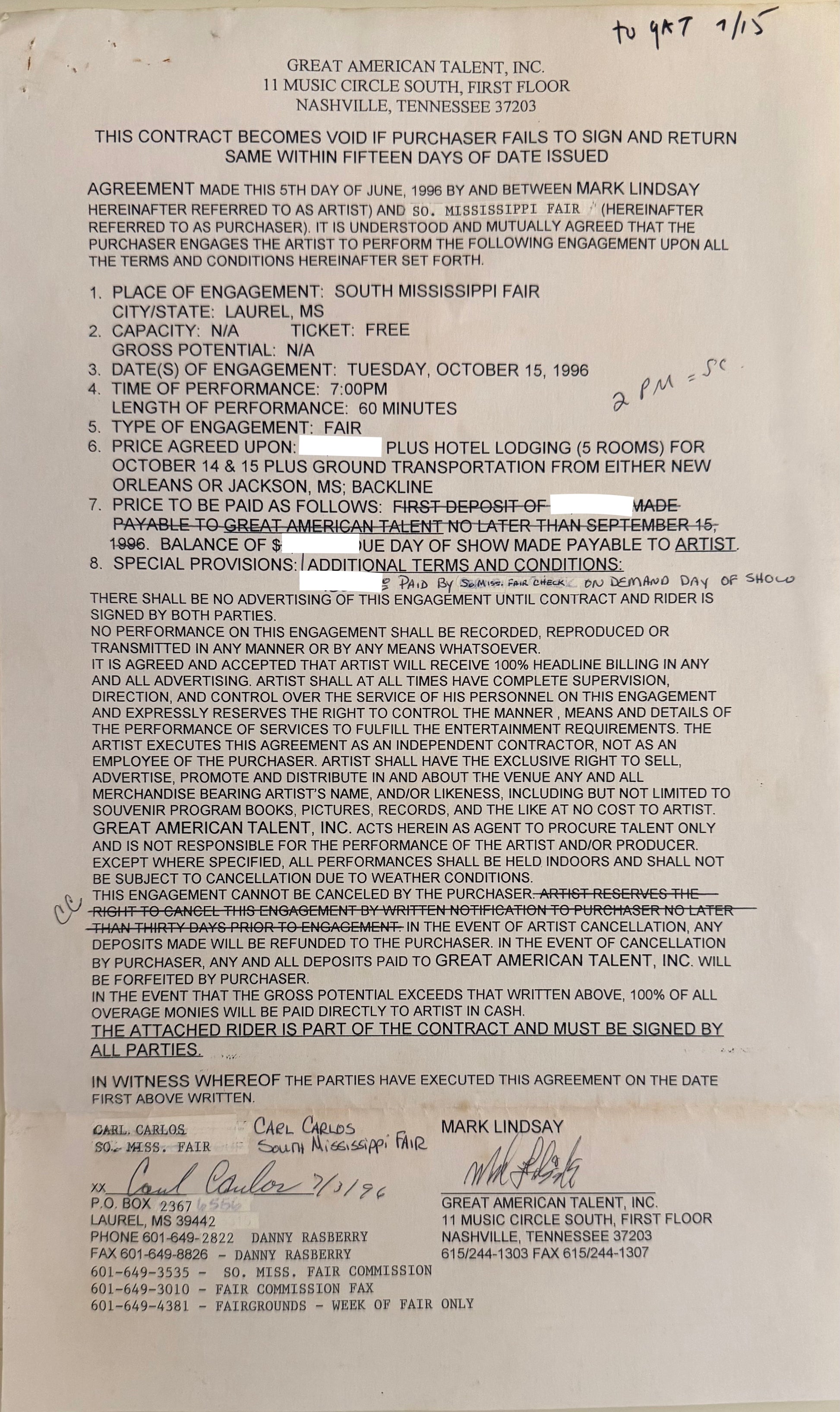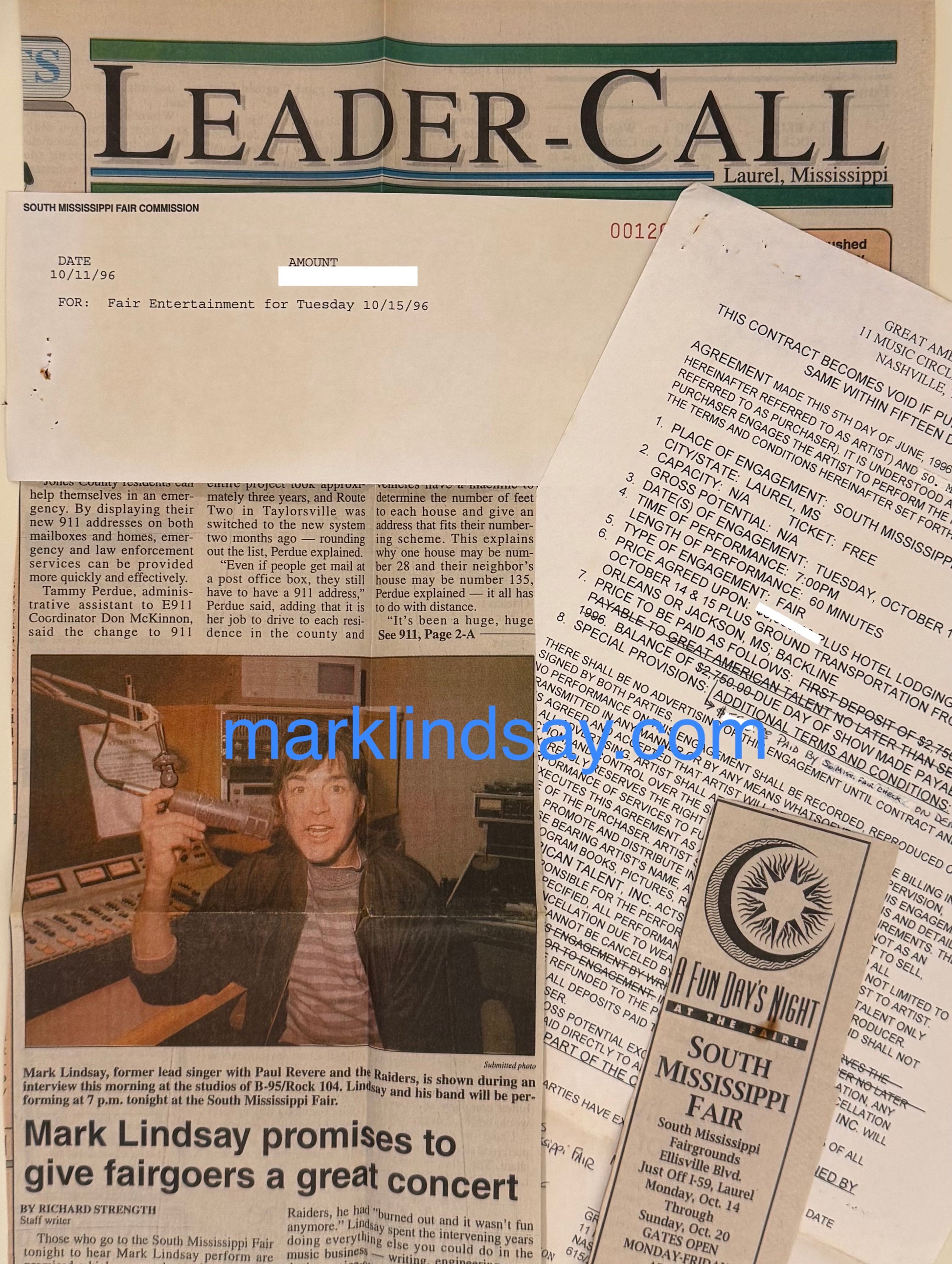 This is an ORIGINAL contract for Mark Lindsay to appear at the South Mississippi Fair in Laurel, MS on October 15, 1996. The package also includes a front page article/interview in the local Leader-Call, as well as a check stub.