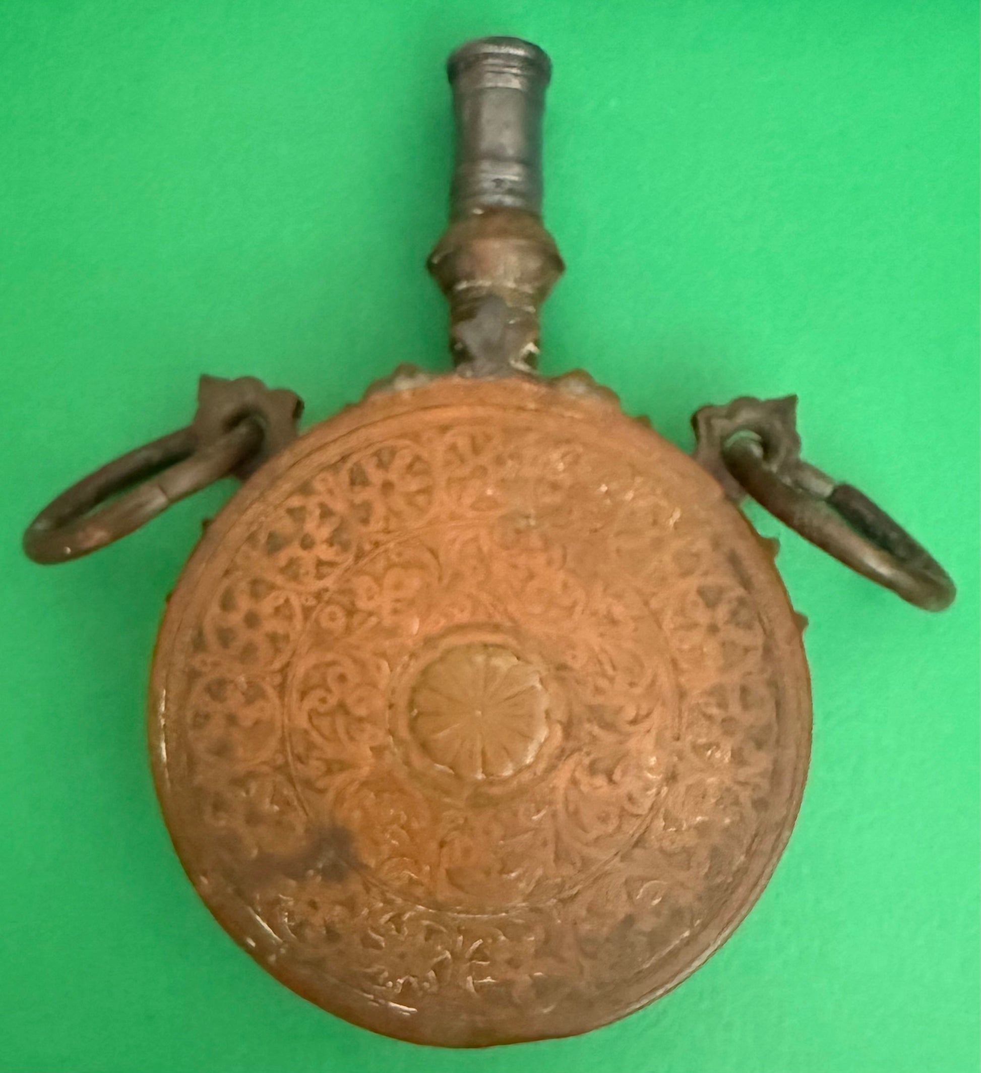 Mark has always haunted antique shops, and when he was in London in 1969 he purchased this very unique piece. It's a large, heavy 19th Century North African Black Powder Flask. It has beautiful engraved patterns, and rings to attach it to a belt or saddle. The spout originally had a cork, and the opening allowed the user to load or dispense gunpowder. It measures approximately 4-1/4" wide, 1-3/4" deep, and 6-1/4" in height, all measurements including rings. It's made of an unknown metal, probably brass, and like many examples of these pieces, might have silver accents. See first picture below for the most likely silver accents. We decided to let YOU determine whether you wanted to clean and change its current patina.