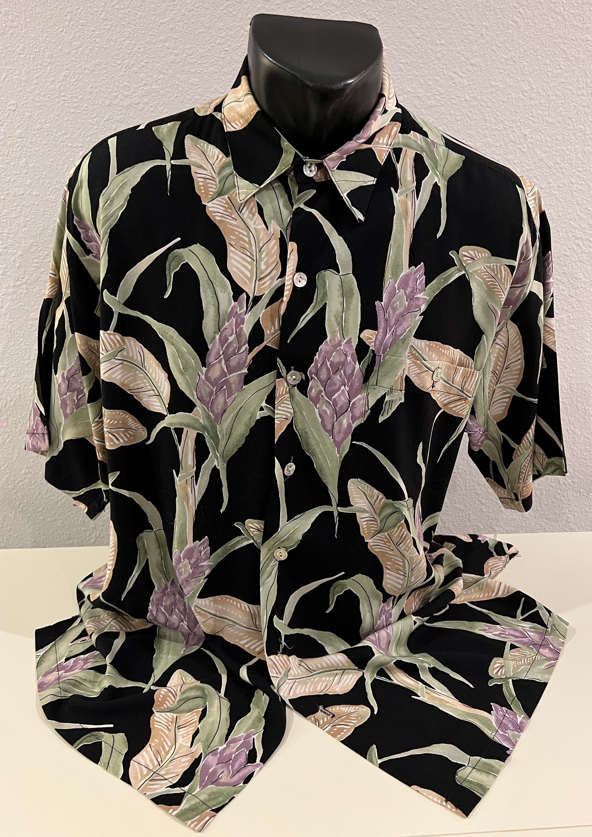 This is a Tori Richard Hawaiian shirt worn by Mark Lindsay on stage at Westbury Music Fair on the Happy Together Tour in 2010 with Micky Dolenz of the Monkees (and on solo shows). It's a Men's size Medium and is 100% fine combed cotton. The pattern is a pale purple, gold, and green floral design on a black background.