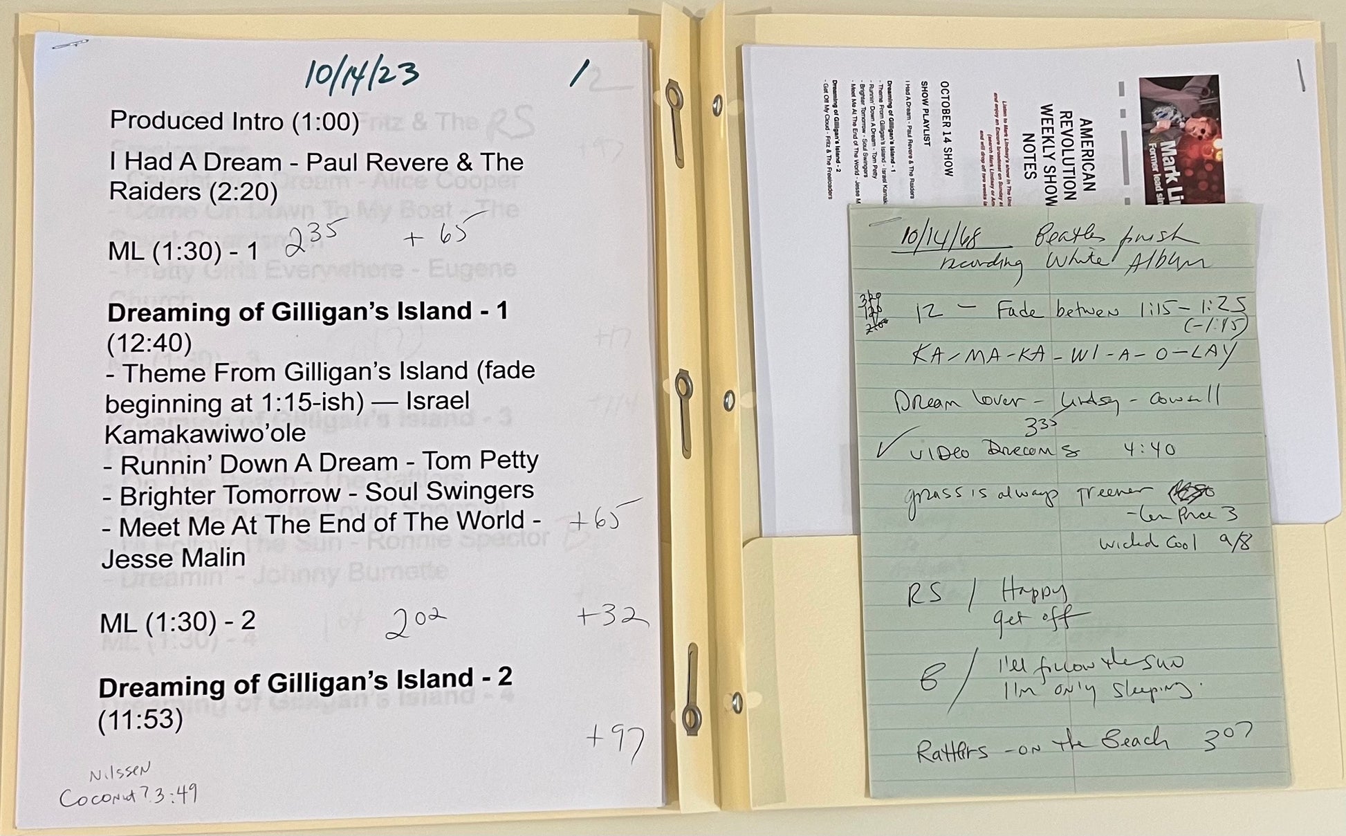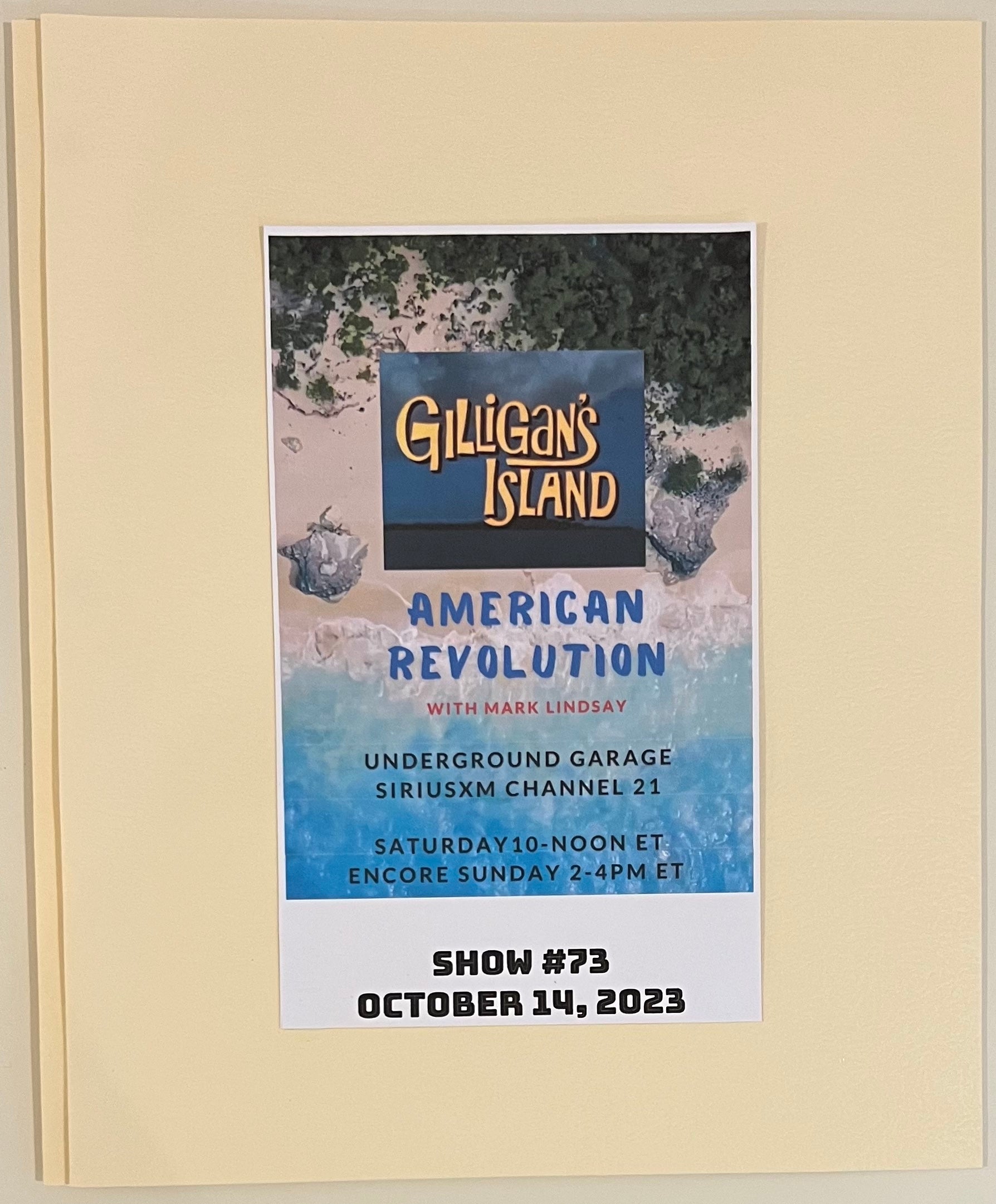 This is a complete package of memorabilia from Mark Lindsay's American Revolution radio show in Little Steven's Underground Garage on SiriusXM Channel 21, for show #73, "Dreaming of Gilligan's Island", which aired on October 14, 2023. It's all organized in a folder, with the promotional graphic used for the show that week on social media. Because of complicated and expensive licensing and ownership requirements, it does NOT contain any audio.