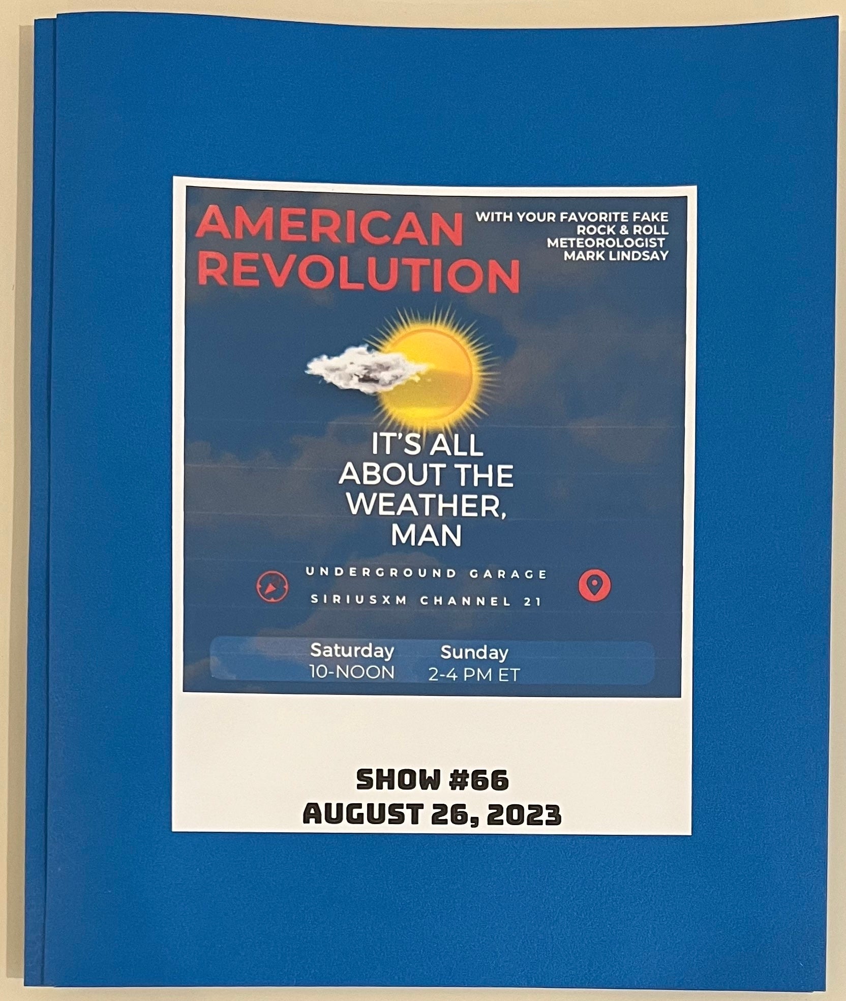 This is a complete package of memorabilia from Mark Lindsay's American Revolution radio show in Little Steven's Underground Garage on SiriusXM Channel 21, for show #66, "It's All About The Weather, Man", which aired on August 26, 2023. It's all organized in a folder, with the promotional graphic used for the show that week on social media. Because of complicated and expensive licensing and ownership requirements, it does NOT contain any audio.