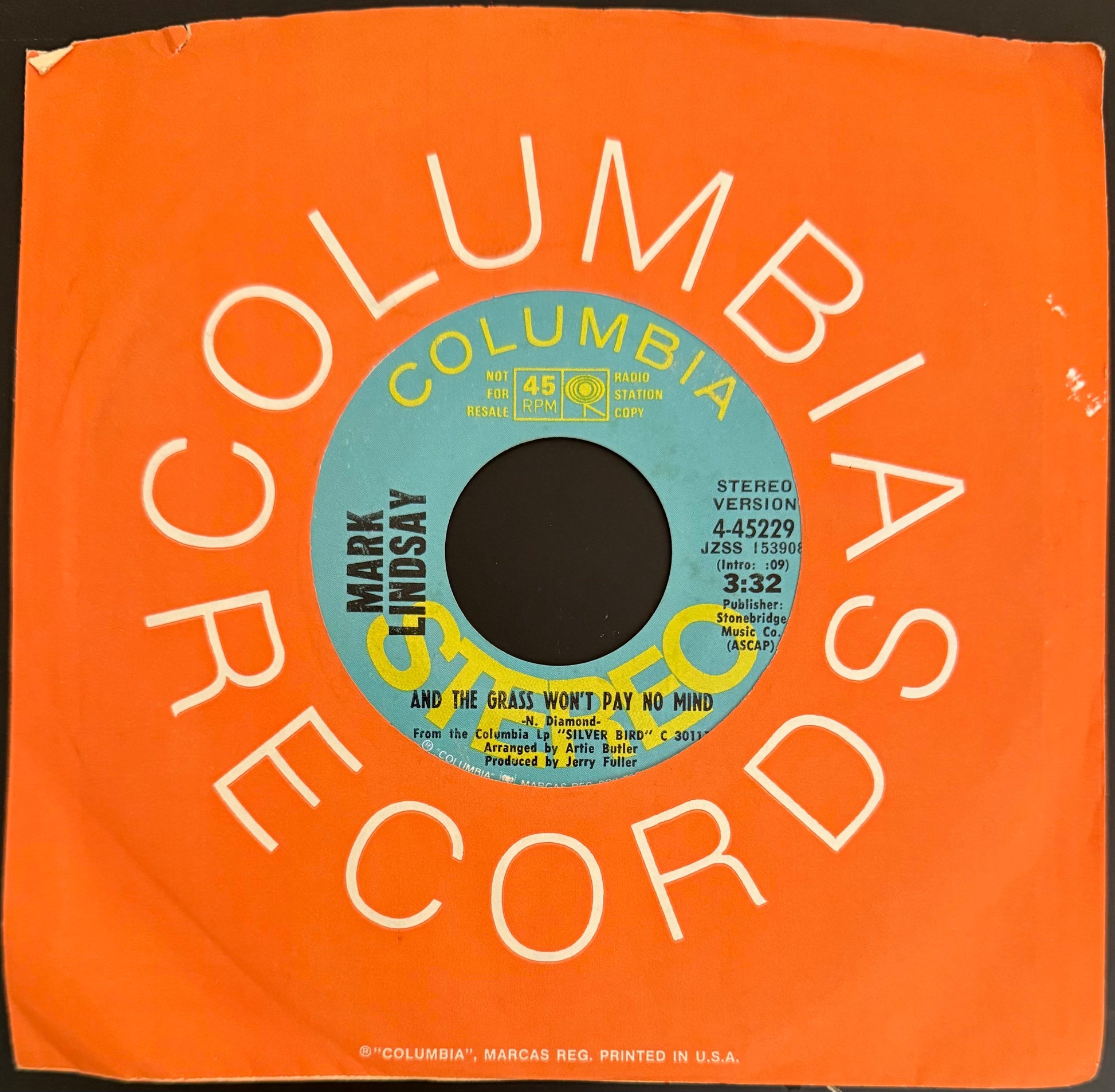From DEEP in the memorabilia vault - VERY LIMITED QUANTITIES - This is one of Mark's original 1969 RADIO STATION vinyl 45's of And The Grass Won't Pay No Mind (double-sided stereo/mono). The vinyl is mint and unplayed. This is from the original shipment of radio station copies sent to Mark in 1969, and he's had it ever since.