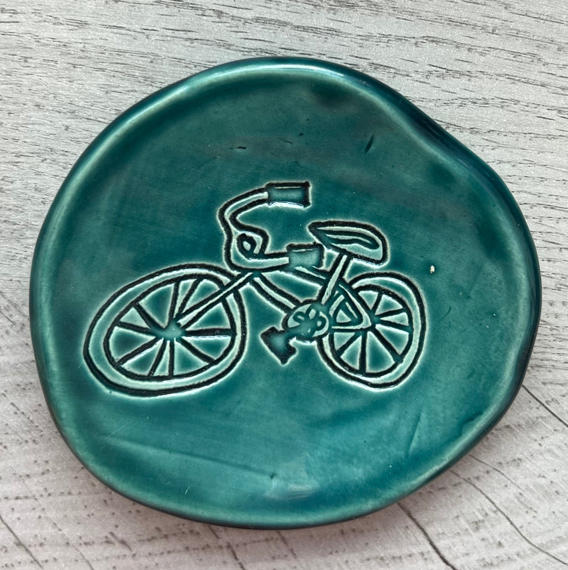 This is an artisan-crafted (Jessica Teesdale) 3-7/8" diameter pottery dish, from our shop in Maine. It features a bicycle design in a tropical teal blue/green, and is perfect for decor, or for vitamins, rings, paper clips, or corralling other small goodies.