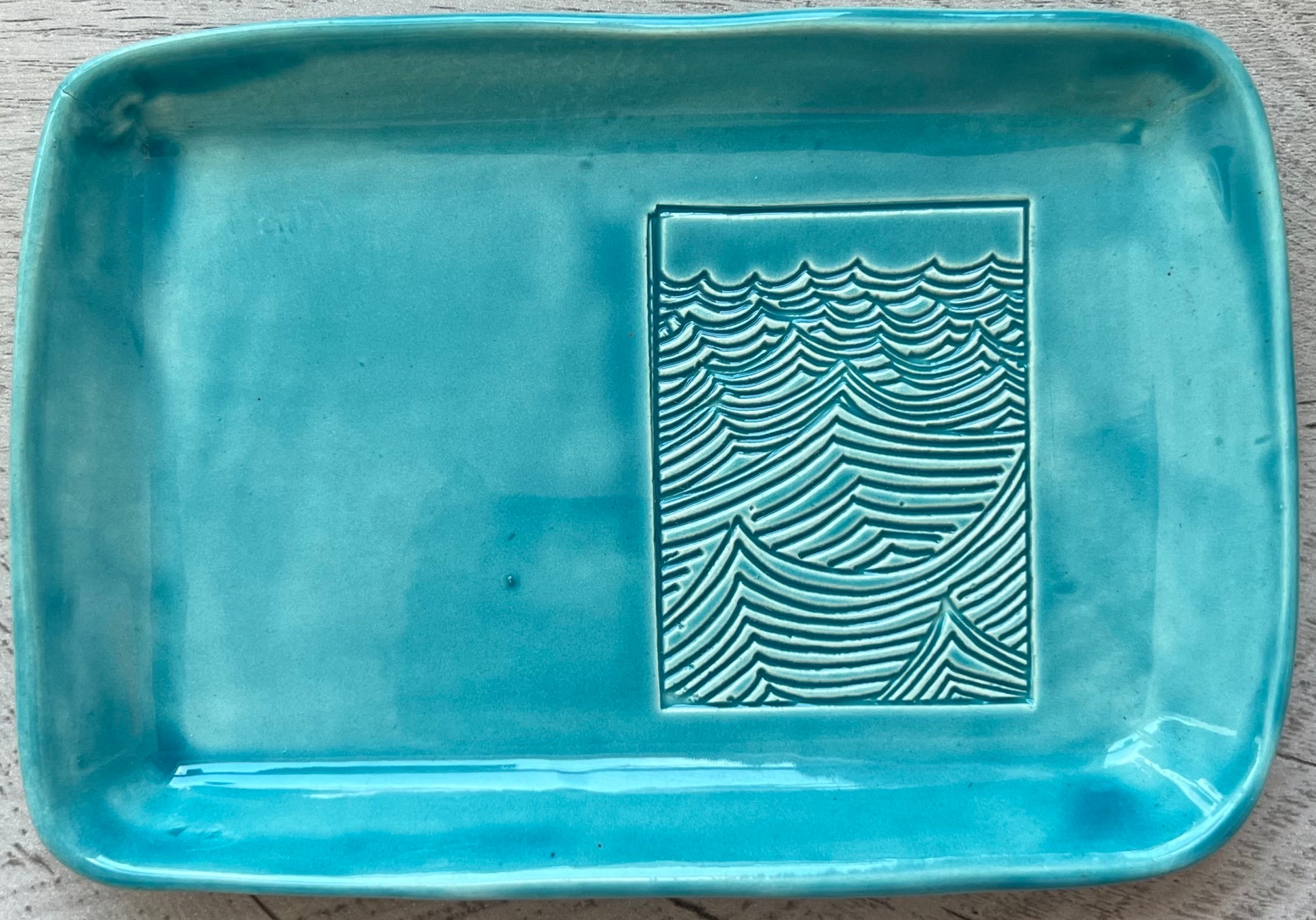 This is a large artisan-crafted (Jessica Teesdale) 4-3/8" x 6-1/4" pottery tray, from our shop in Maine. It features a wave design in a tropical turquoise, and is perfect for decor, or for a coaster or sponge/soap dish, or corralling vitamins, rings, paper clips, or other small goodies.