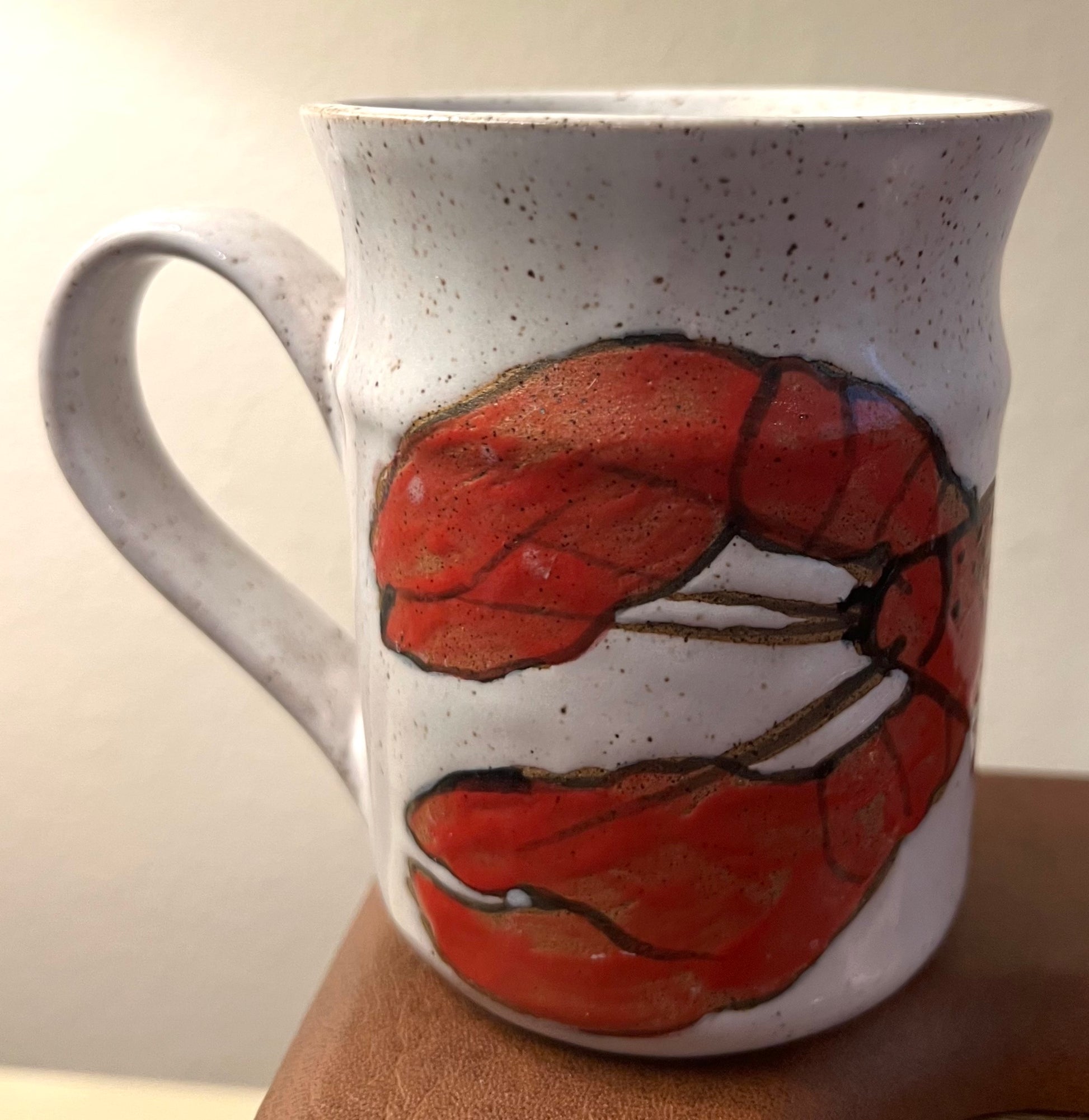 From our shop in Maine: This is a handpainted lobster mug, made in Maine by one of our favorite artisans. Measures 4" tall and 3-1/4" in diameter, excluding handle. Perfect for keeping coffee, tea, or even soup/chowder hot.