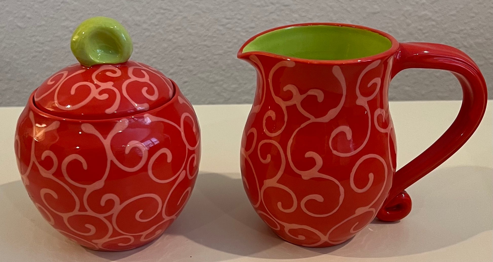 From our shop in Maine: This is a handpainted ceramic sugar and creamer set, made in Maine by one of our favorite artisans, Lacey. The pitcher measures 4-1/2" tall and 5-3/4" in diameter, including the handle. The creamer measures 5" tall and 4-1/4" in diameter. Great in the kitchen, but would also make a colorful addition to your desk, with pens and pencils in the pitcher and paper clips in the covered dish.