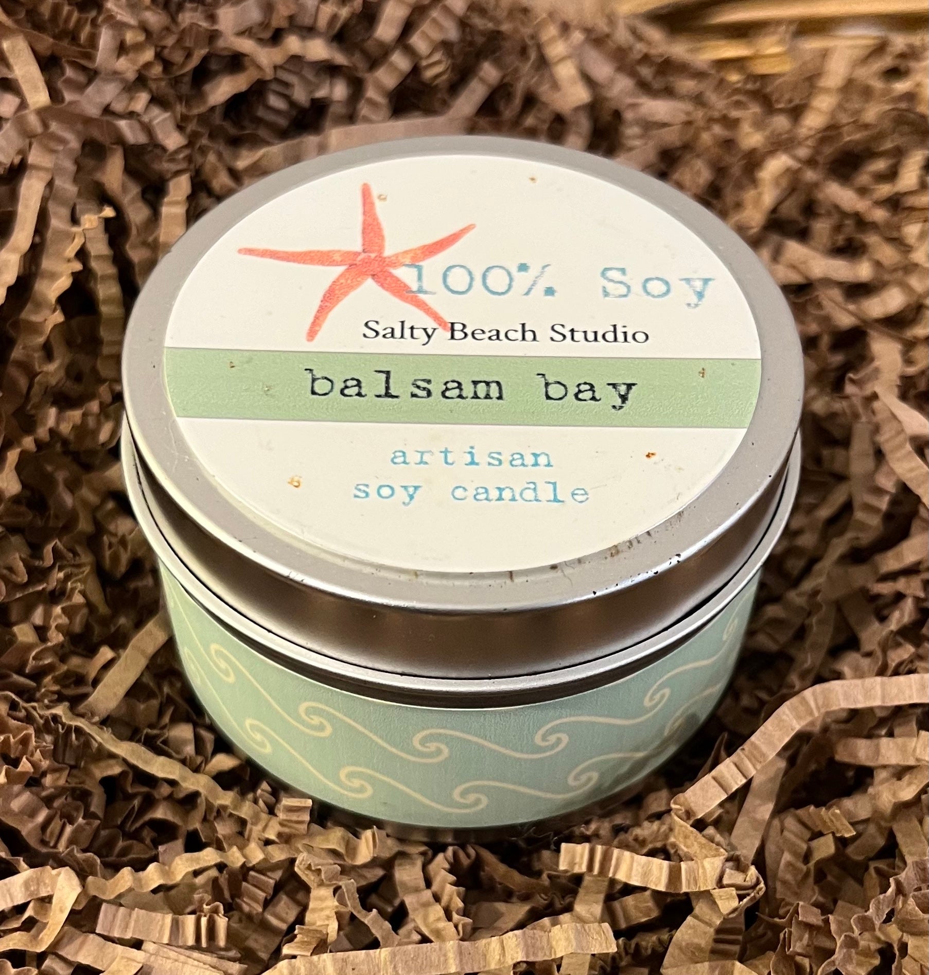 This is a balsam-scented, long-burning soy candle in a metal container, hand-poured by a woman artisan on the coast of Maine. Measures 2-7/8" in diameter and