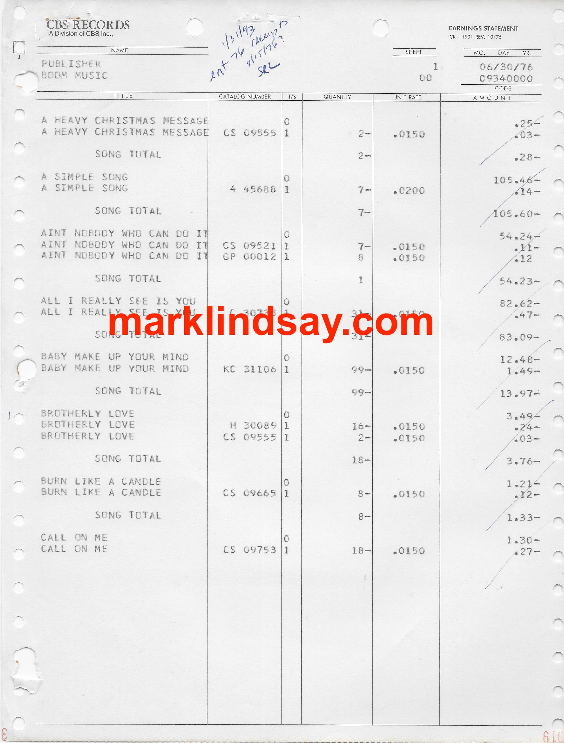 Boom Music June 1976 CBS Royalty Statement - Personally Autographed to YOU by Mark