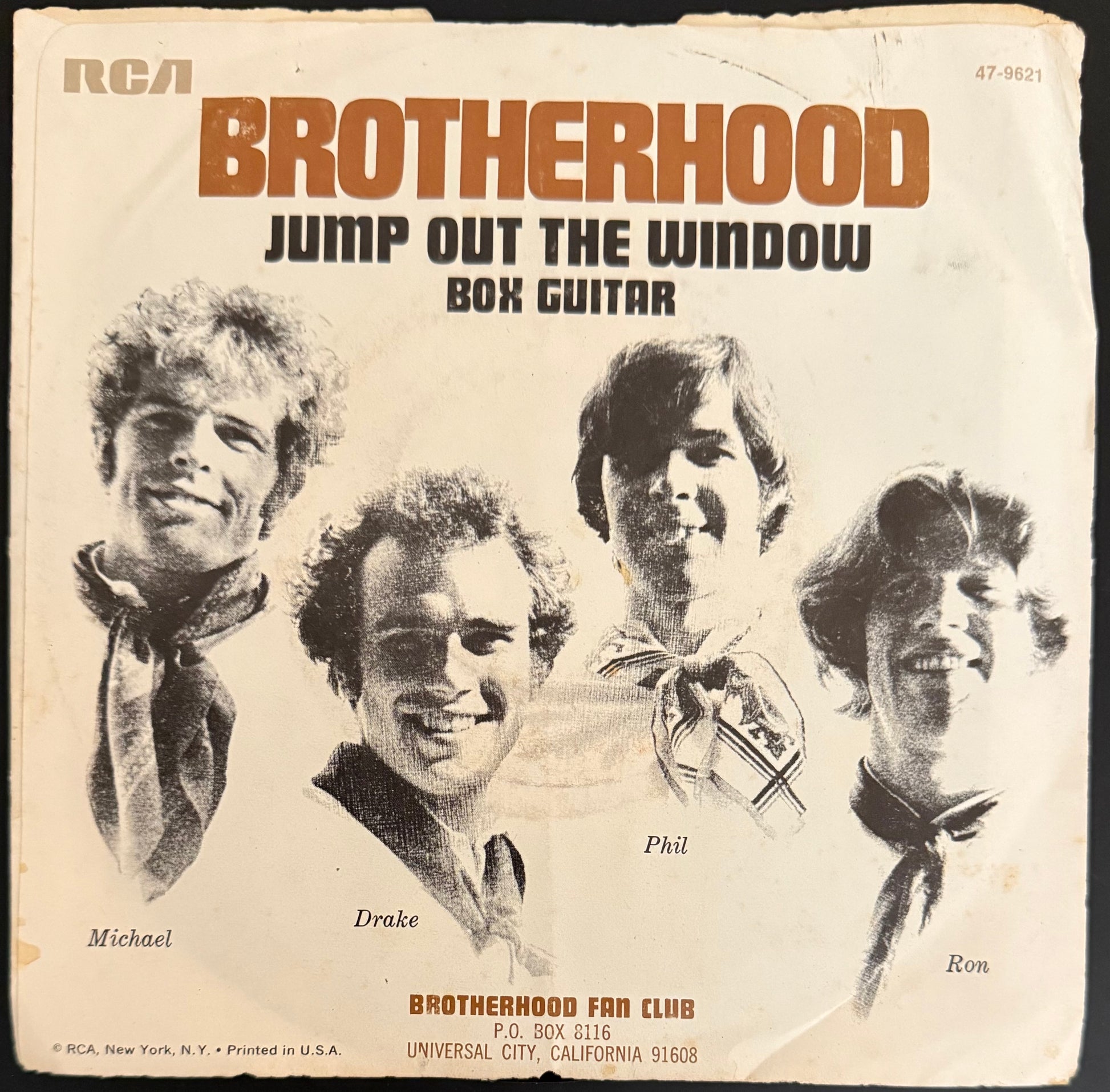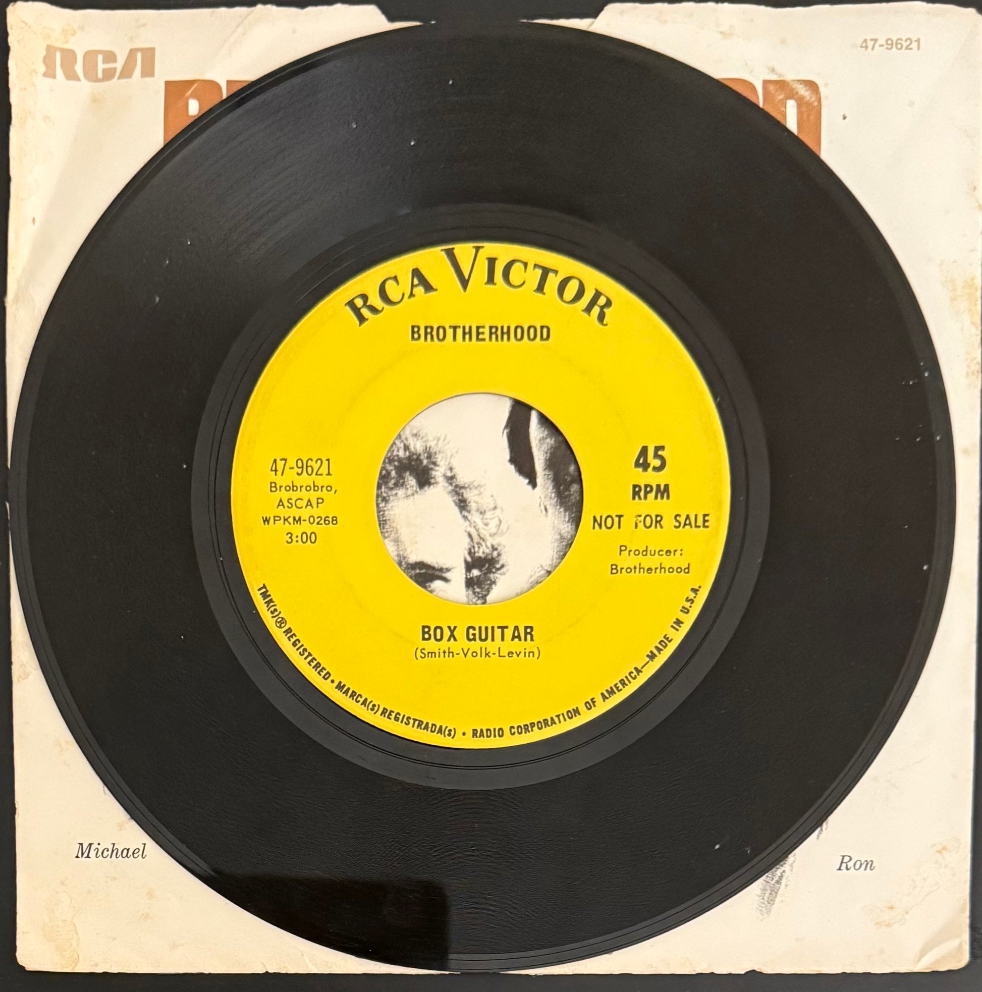 From DEEP in the memorabilia vault - ONE ONLY - This is Mark's copy of 1968 DEMONSTRATION vinyl 45 of Brotherhood's Box Guitar/Jump Out The Window (momo). The vinyl is in very good condition and was only played once or twice. Please see photos for picture sleeve condition. Brotherhood is a group formed by Phil, Drake, and Smitty after they left the Raiders in 1967.