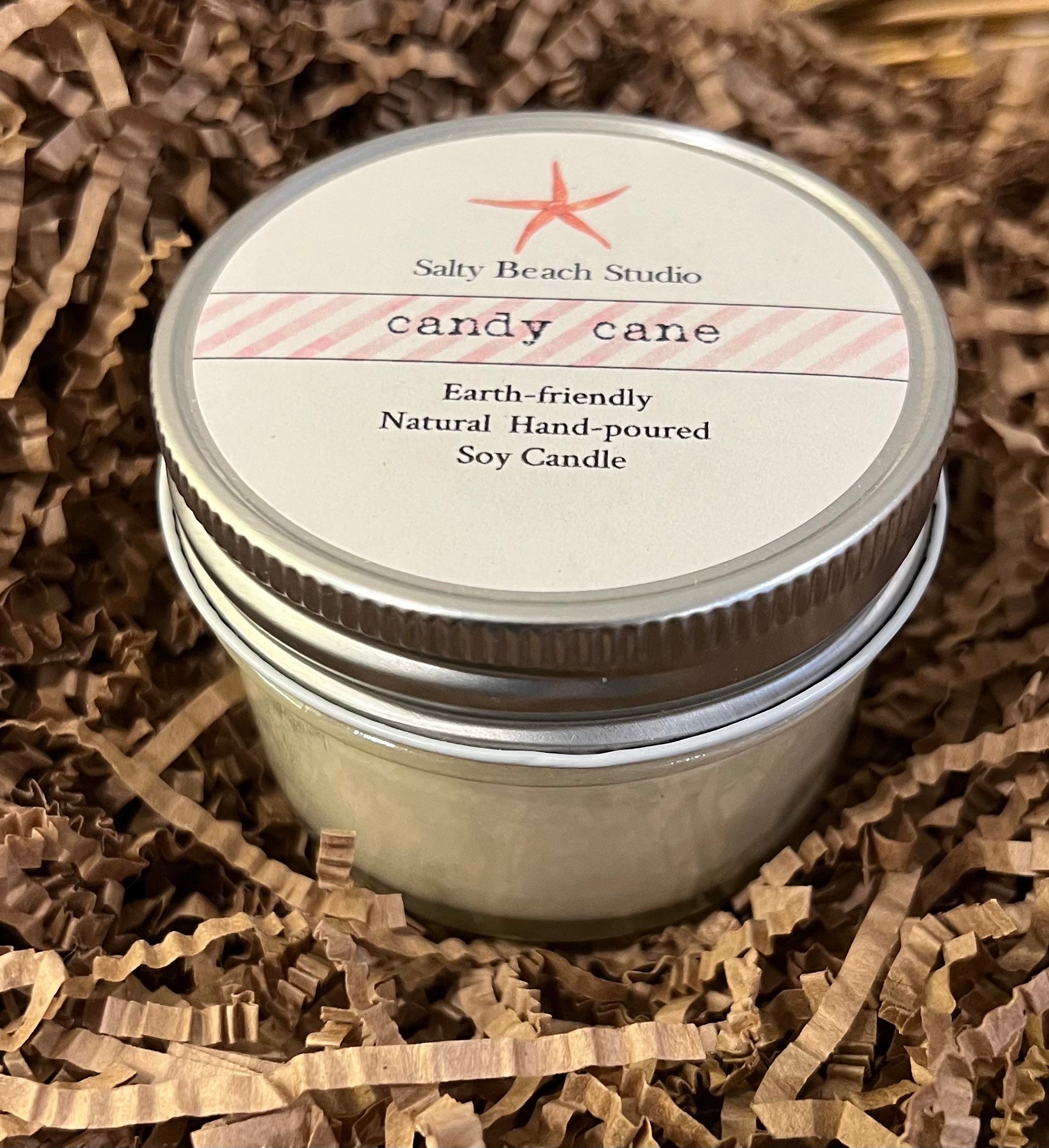 This is a candy cane-scented, long-burning soy candle in a glass container, hand-poured by a woman artisan on the coast of Maine. Measures 2-7/8" in diameter and