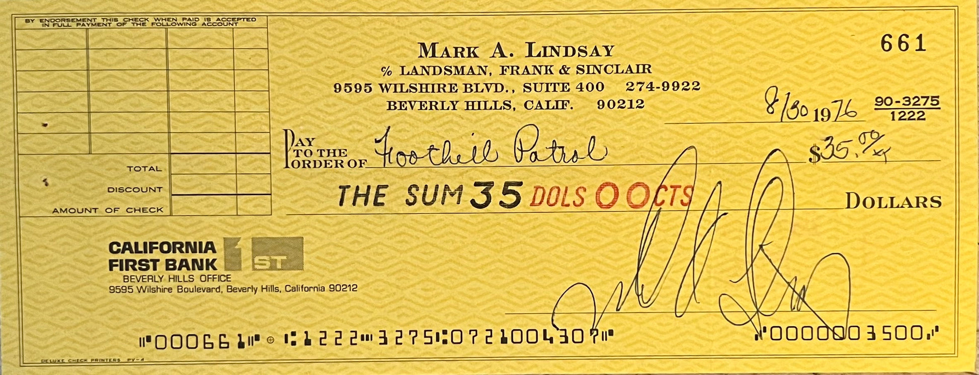 This is an original August 30, 1976 check from Mark Lindsay's personal account payable to Foothill Patrol, who provided security to his home on Wonderland Avenue in the Hollywood Hills. The check is signed by Mark.
