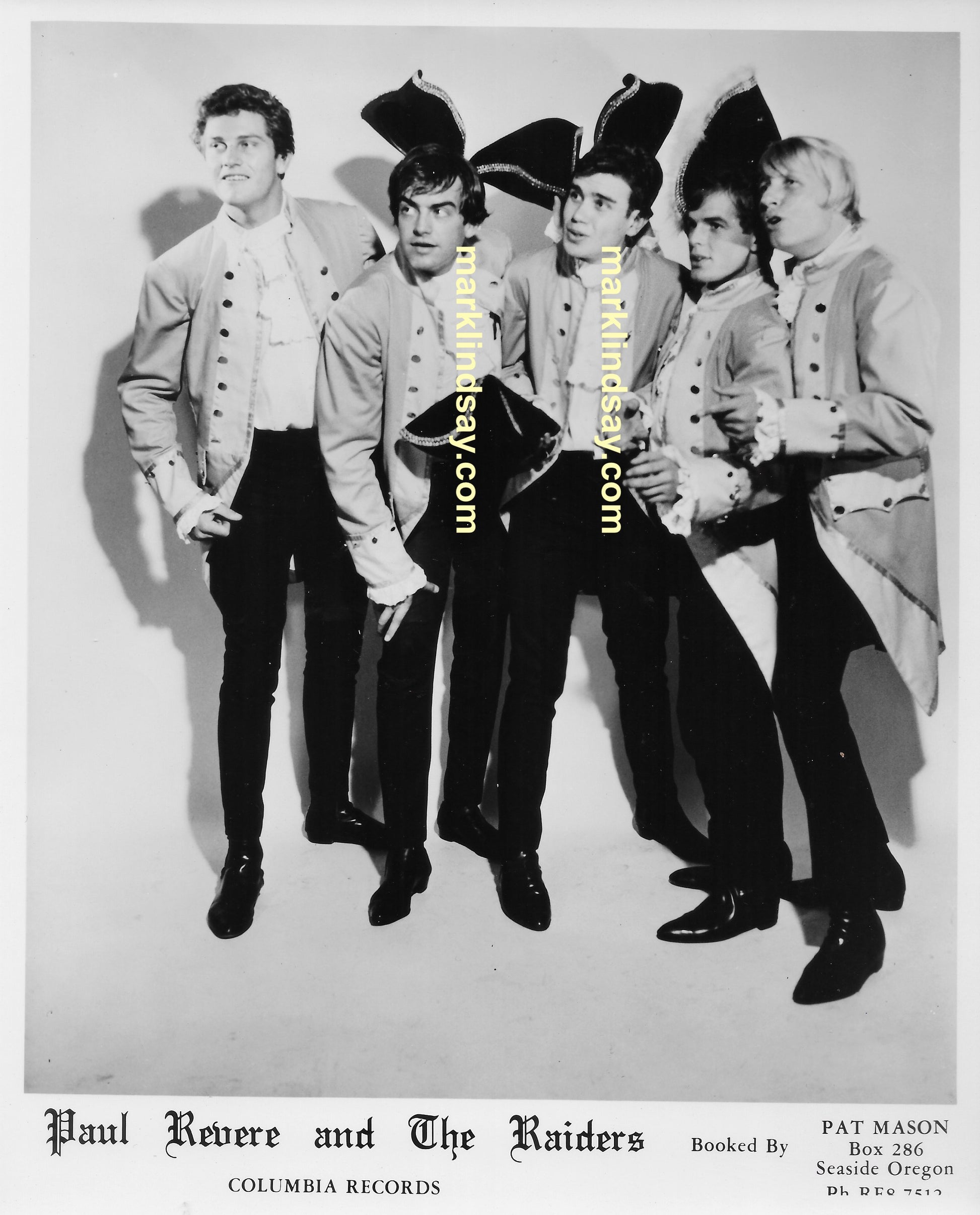 This is an ORIGINAL glossy-finish 8"x10" photo of the Raiders from 1964. This is one of the vintage copies printed at that time, not a reproduction. It depicts, from L-R, Mike "Doc" Holladay (bass), Mark, Drake, Smitty, and Paul. Pat Mason in Seaside, OR (contact info) was their agent at the time.