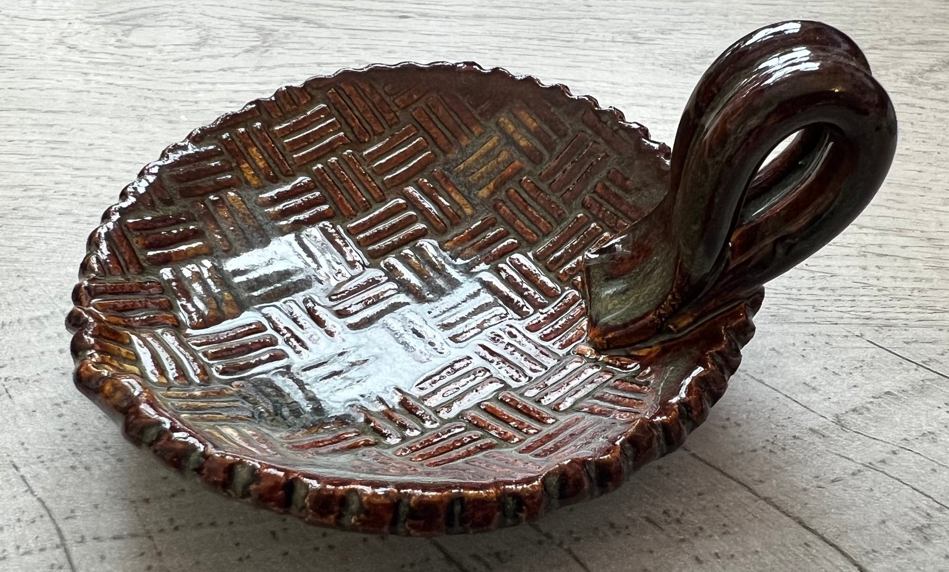 It comes with a one of a kind artisan-crafted pottery piece (measuring approximately 3" in diameter and 2" high) from our shop in Maine, which can be used as a teabag holder, a mug topper to keep a drink warm, a spoon rest, a ring holder, a place to put your vitamins, a votive candle holder, or use your imagination! (Please note that any white spots on the pottery photos are reflections.) All pieces are food safe and can be put in the dishwasher. They are completely glazed on the top and partially glazed on the bottom and have a curved shape.