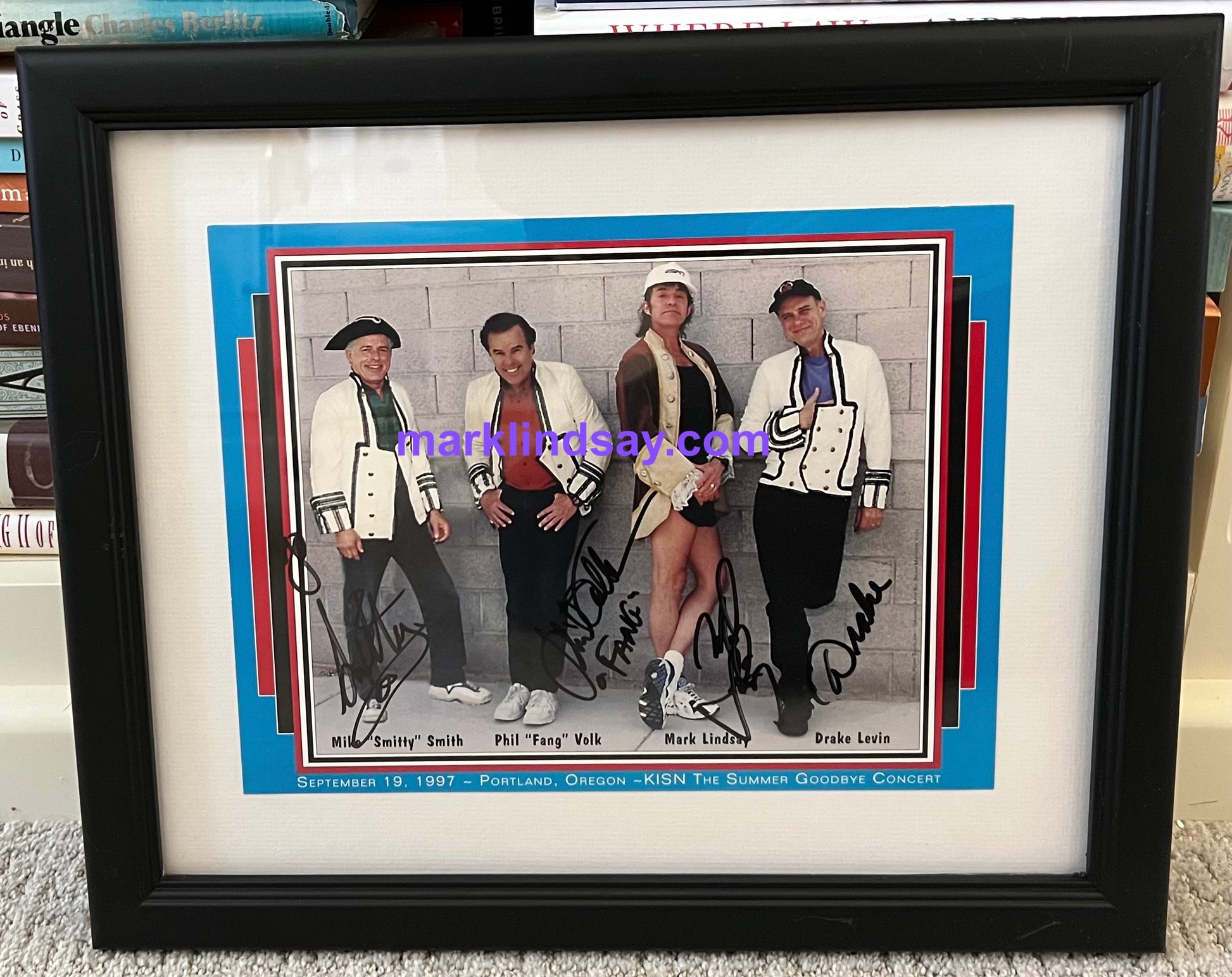 This is a CUSTOM FRAMED lithograph of Mark, Smitty, Phil, and Drake SIGNED BY ALL OF THEM, which hung on the wall as decor at Mark Lindsay's Rock & Roll Cafe in Portland Oregon. The entire framed piece measures 15" wide x 13" high.
