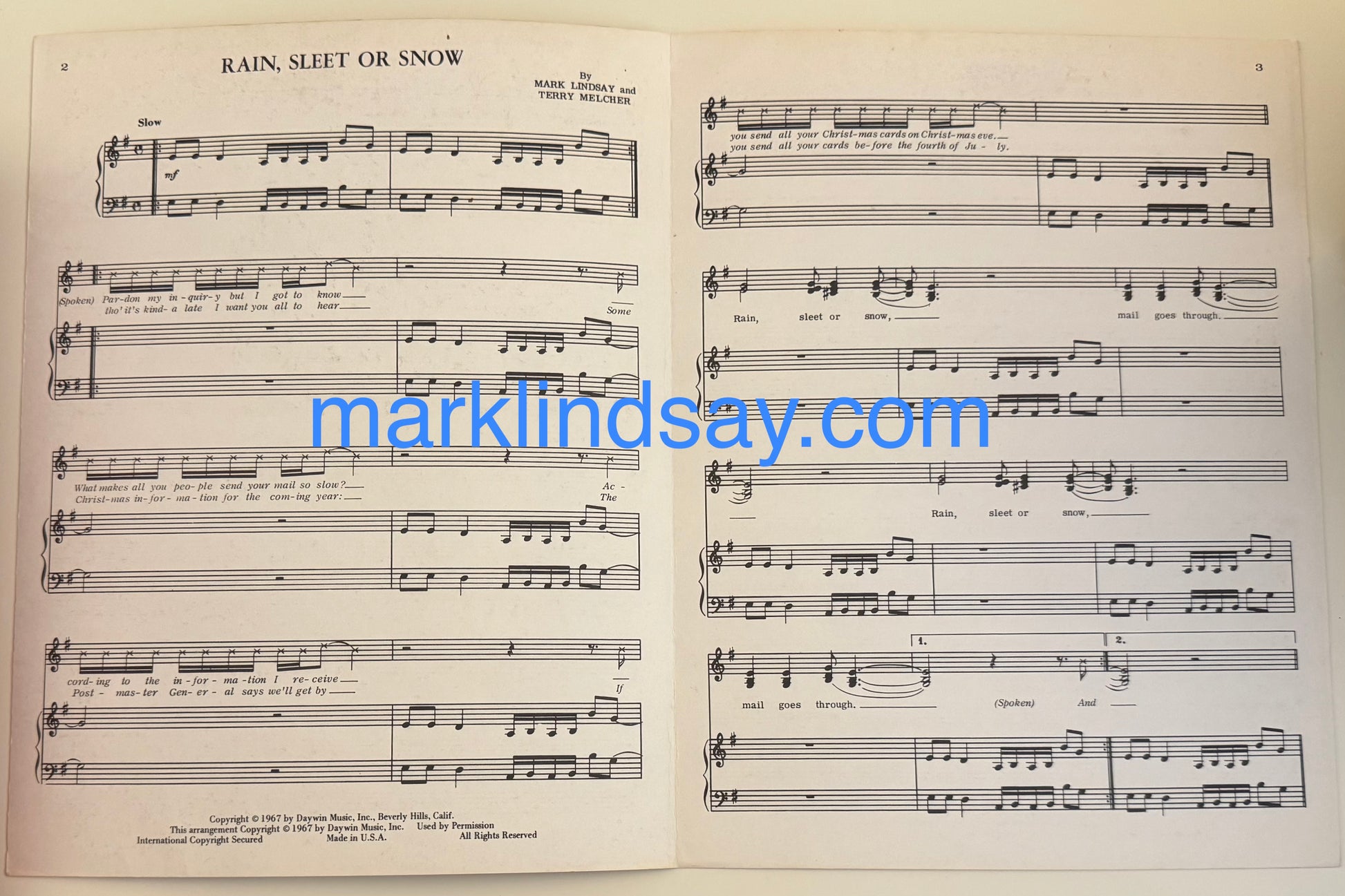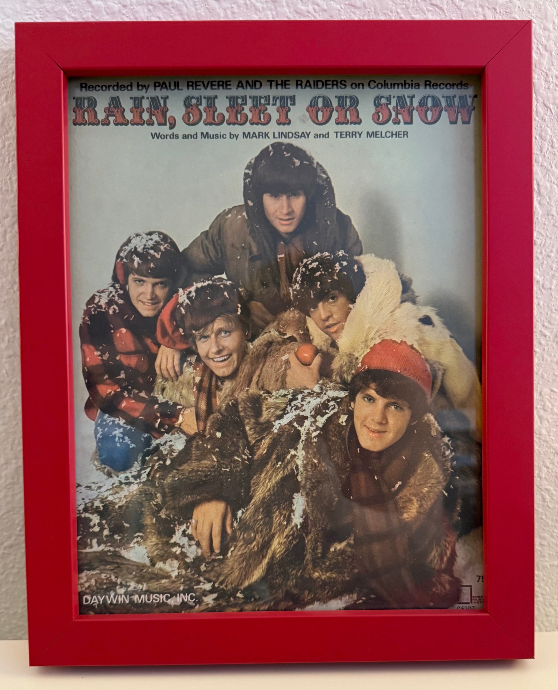 ONE ONLY - From Mark Lindsay's collection, this is an EXTREMELY RARE, framed 1967 sheet music brochure for RAIN, SLEET, OR SNOW, written by Mark Lindsay and Terry Melcher for the Raiders' Christmas Present...or Past album. What makes it so rare is that it was scheduled as a single, but after Columbia found out how much radio programmer Bill Drake HATED the album (he ripped it off the turntable at a party where Mark and Terry had brought him the album, and it was impaled in the plush wallpaper), the single was cancelled. And only a few of the already-printed sheet music copies escaped before being destroyed.