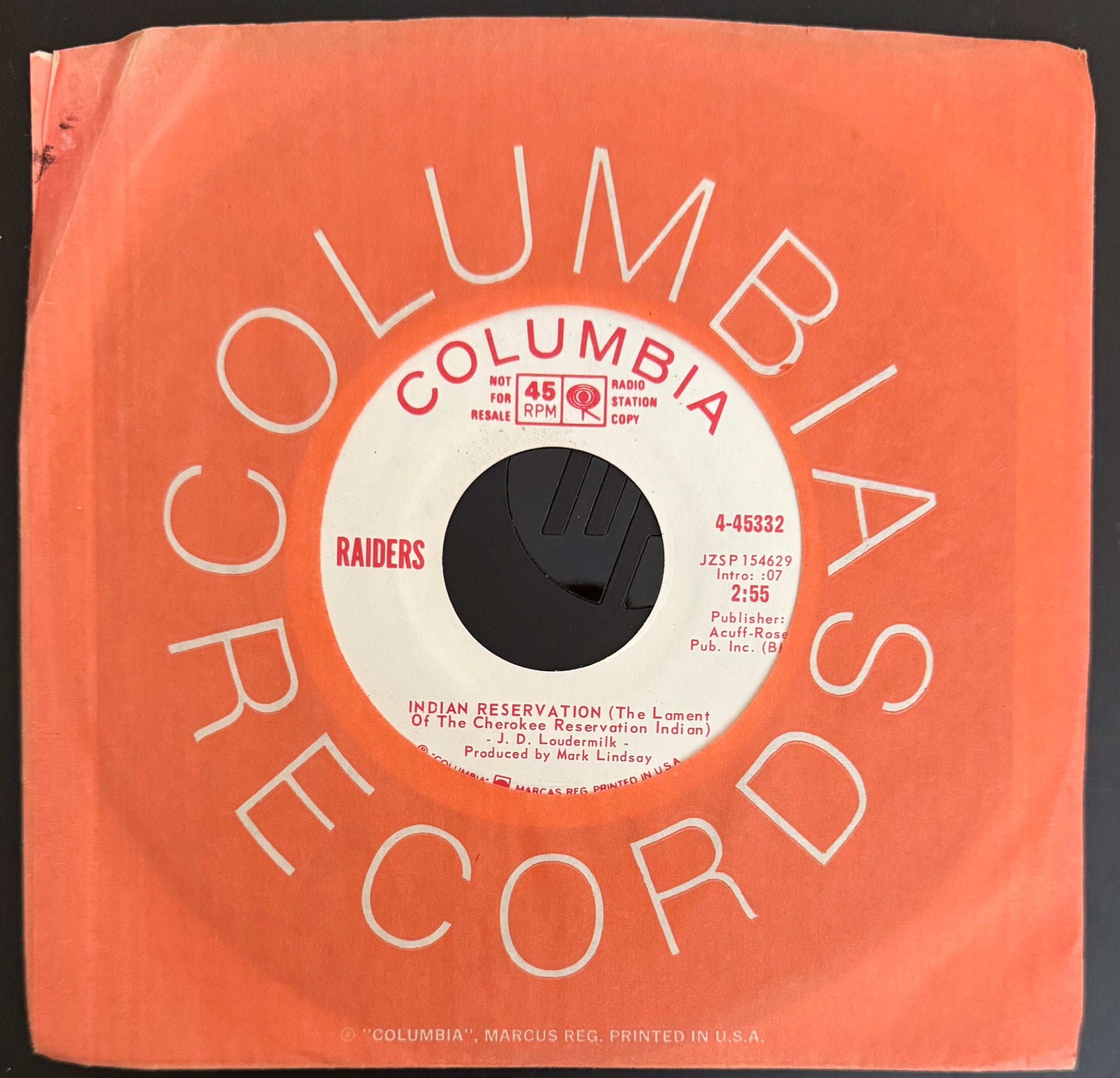 From DEEP in the memorabilia vault - VERY LIMITED QUANTITIES - This is one of Mark's original 1971 RADIO STATION vinyl 45's of Indian Reservation (double-sided). The vinyl is mint and unplayed. This is from the original shipment of radio station copies sent to Mark in 1971, and he's had it ever since.