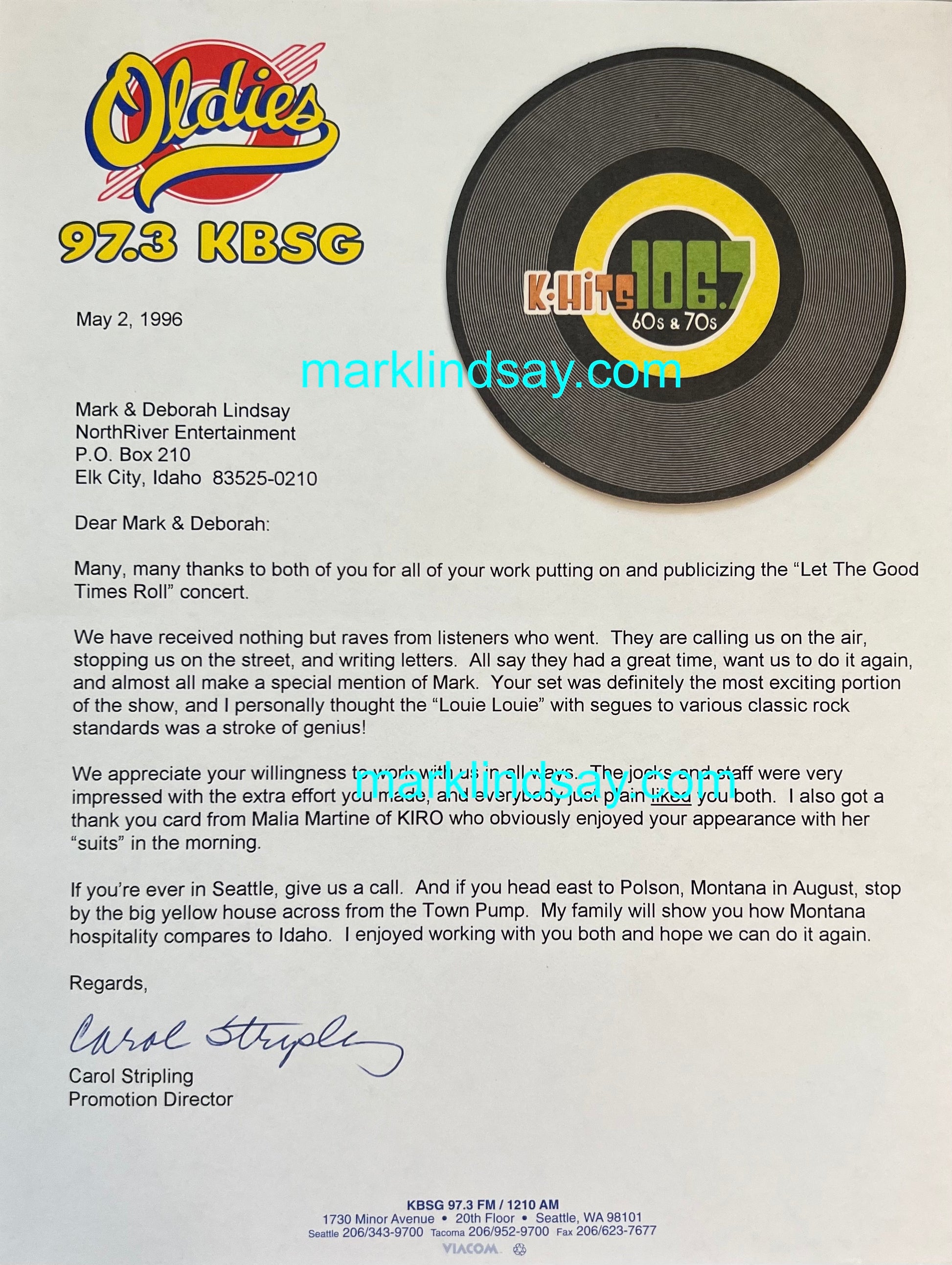 This is an ORIGINAL 1996 letter to Mark Lindsay (8-1/2" x 11") from radio station KBSG in Seattle, WA. Mark did a show for them earlier that year, with Peter Noone and Davy Jones.