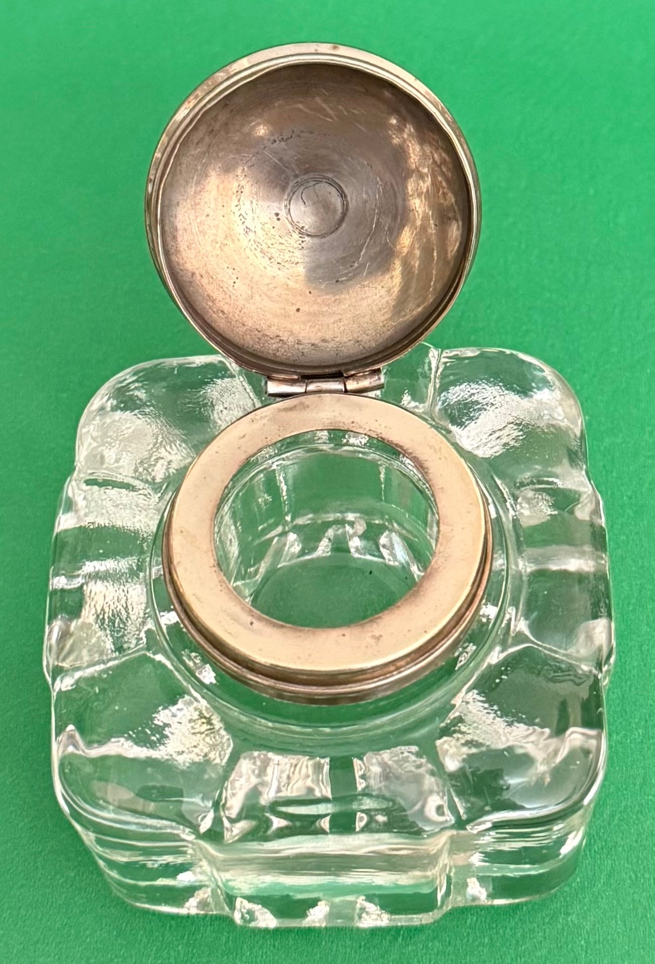 Mark has always haunted antique shops, and when he was in London in 1969 he began his vintage inkwell collection. This large, heavy inkwell measures approximately 2-3/4" wide and 2-3/4" in height, including top. It's made of heavy glass with an interesting crenulated pattern on the bottom edges. The top is hinged to expose the inkwell and is made of an unknown metal. We decided to let YOU determine whether you wanted to clean and change its current patina. No chips.