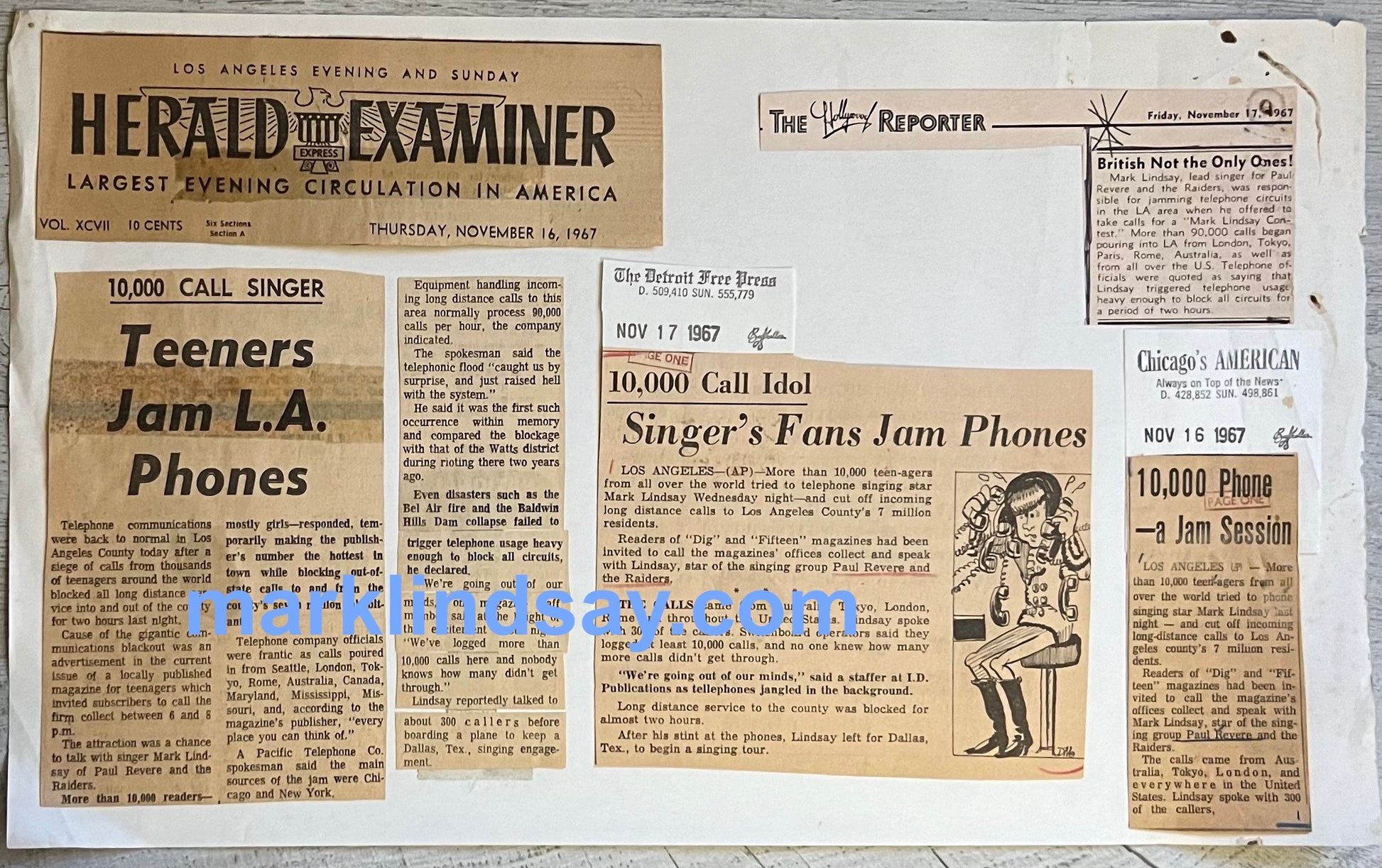 These are the original clippings sent to the Raiders' office by their newspaper clipping service, which gathered up mentions of the group in newspapers across the country. (Kind of a very slow and limited Google of its time.) It includes the 11/16/67 clip from the Los Angeles Herald Examiner, recounting the night that a teen magazine asked fans to call Mark at their office - with the result that 10,000 callers cut off all long distance communication to the West Coast for hours.