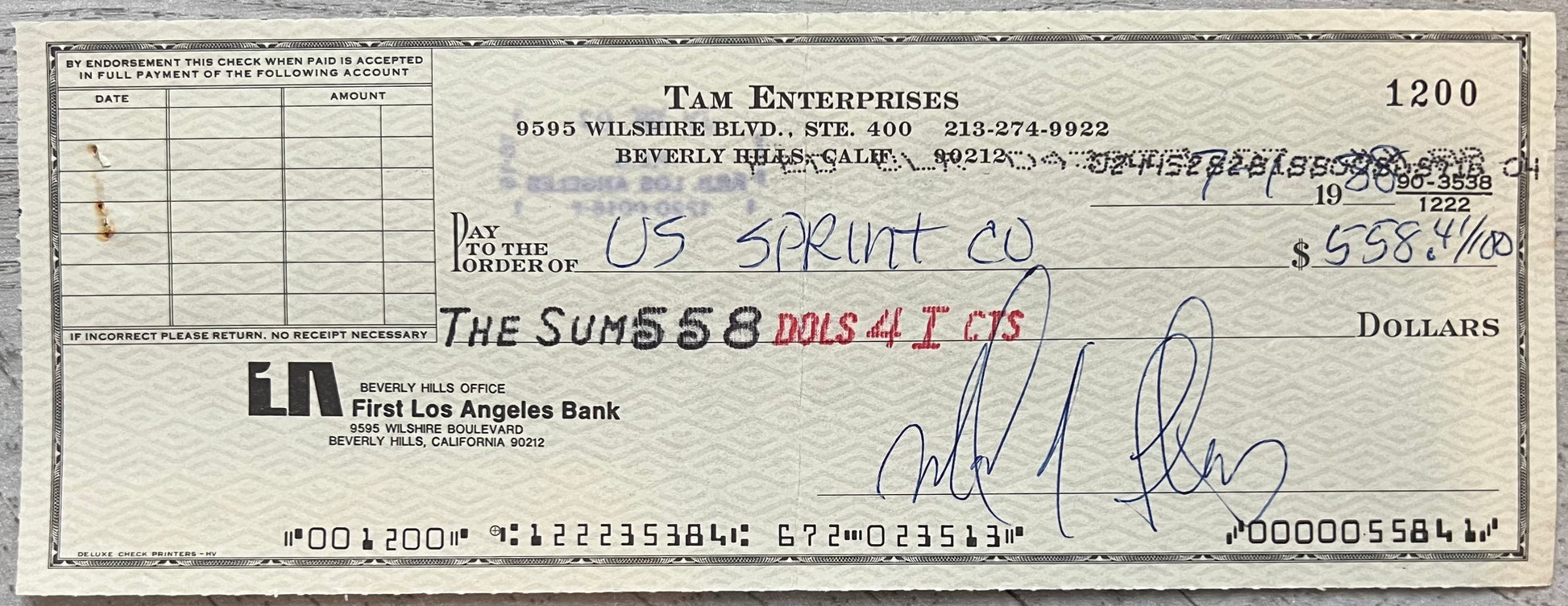 This is an original July 1, 1988 check from Mark Lindsay's production company (TAM Enterprises) business account payable to Sprint. The check is signed by Mark.