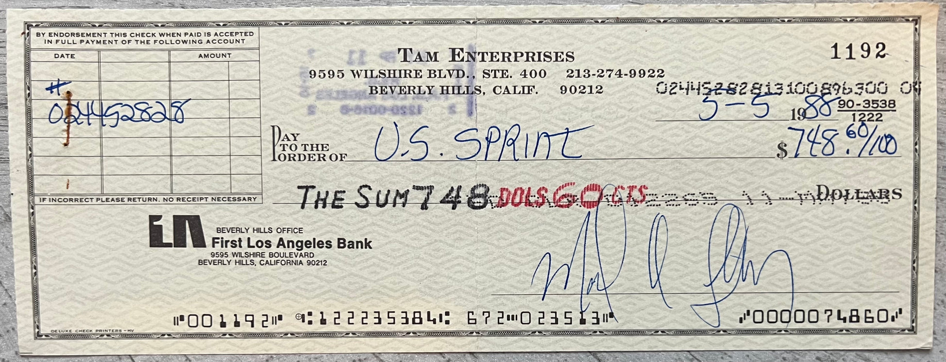 This is an original May 5, 1988 check from Mark Lindsay's production company (TAM Enterprises) business account payable to Sprint. The check is signed by Mark.