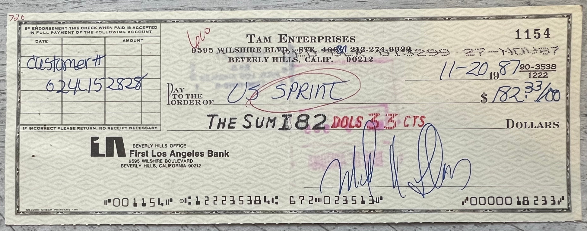 This is an original November 20, 1987 check from Mark Lindsay's production company (TAM Enterprises) business account payable to Sprint. The check is signed by Mark.