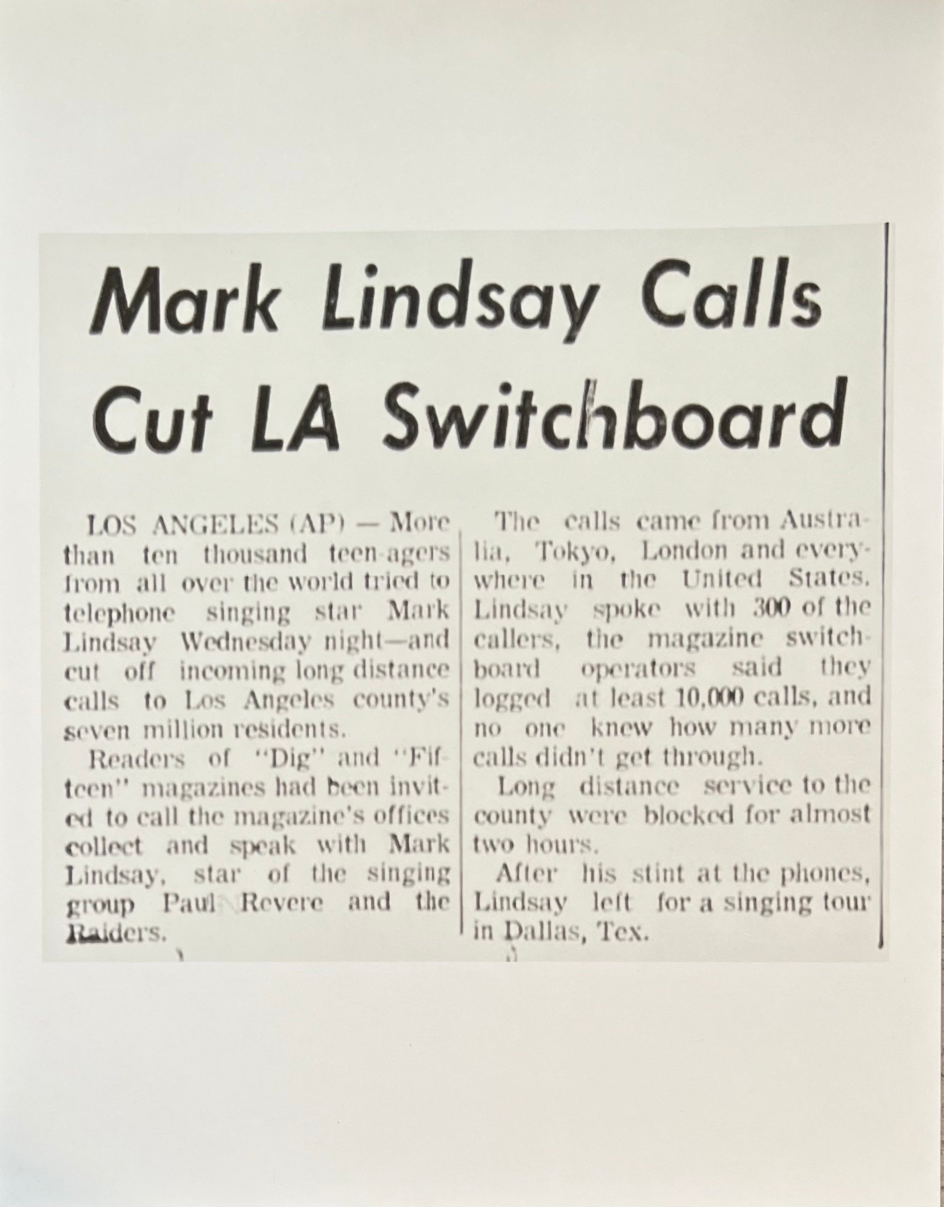 On November 15, 1967, a teen magazine's promotion inviting readers to call Mark at their offices went badly awry, and the 10,000+ incoming calls completely overwhelmed the entire west coast telephone system, creating a phone "blackout" for hours.