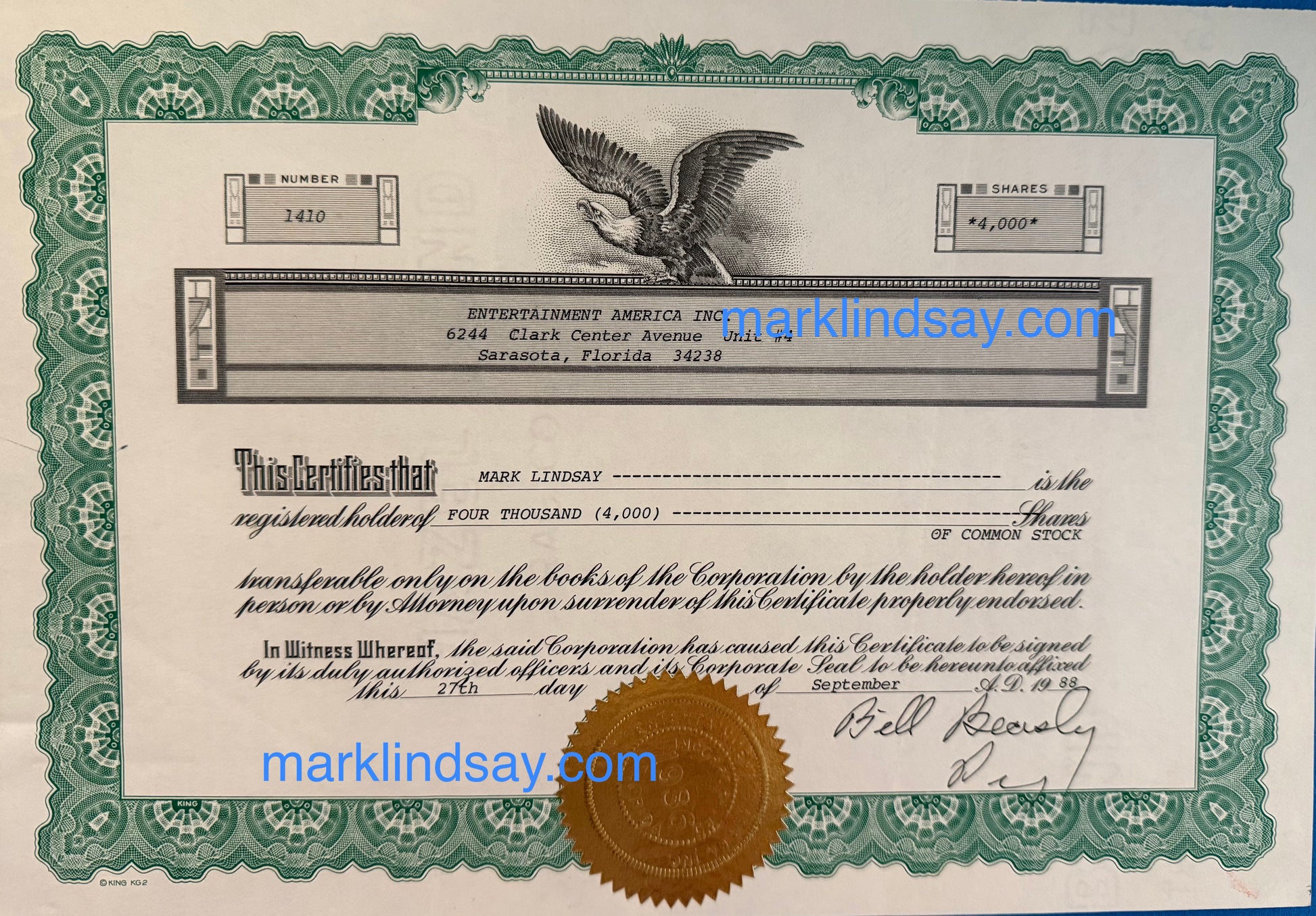 This is an original Entertainment America stock certificate issued September 27, 1988 to Mark Lindsay in the amount of 4000 shares. Mark received it in exchange for work he did for the company in Nashville.