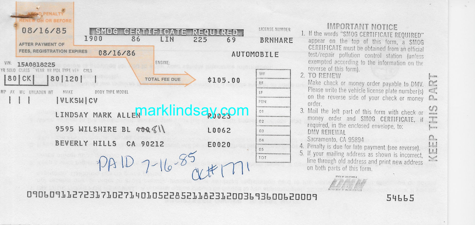 This is Mark Lindsay's 1985 California DMV Registration for his 1980 brown VW Rabbit (plate: BRNHARE) (measures 4" x 7-7/8"), plus 3 other documents: