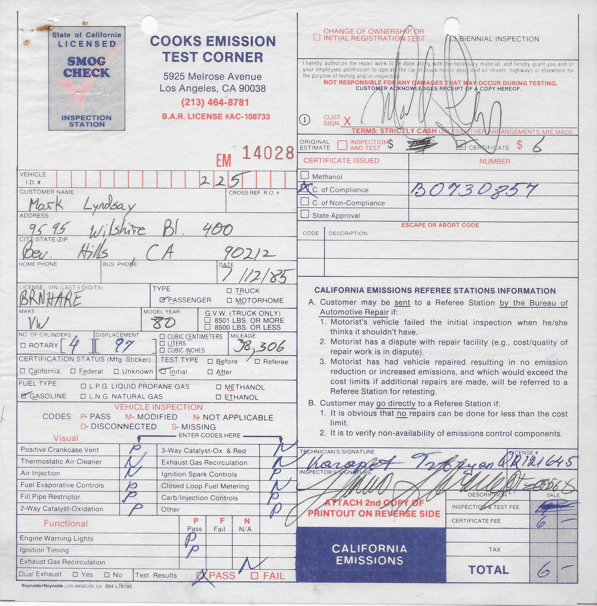 - Smog Check from Cook's Emission Test Corner, dated 7/12/85, with an original signature of Mark Lindsay (8-1/2" square)