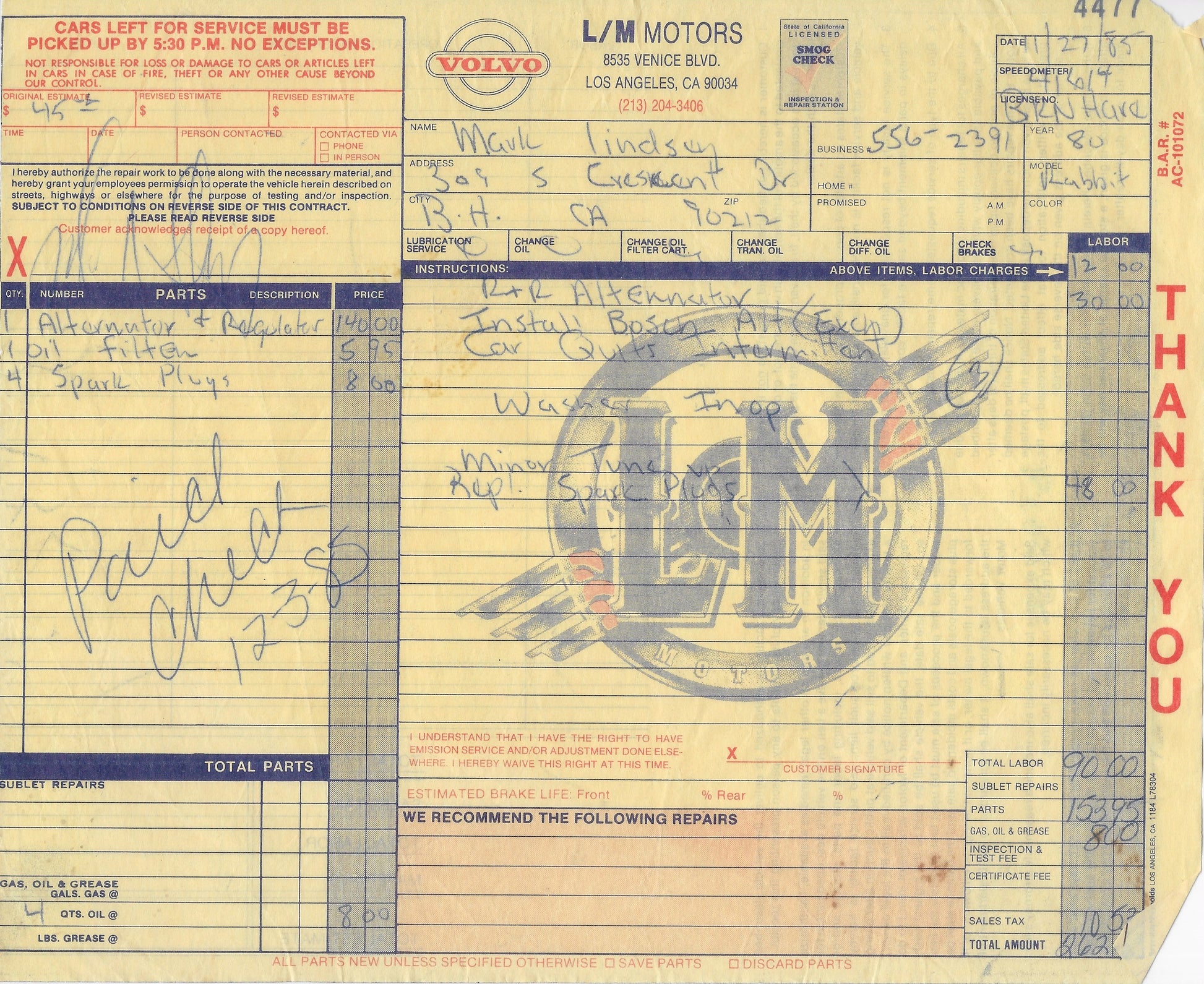 - Repair Order from L/M Motors, dated 11/27/85, with a carbon copy of Mark's signature (8-1/4" x 10-1/4")