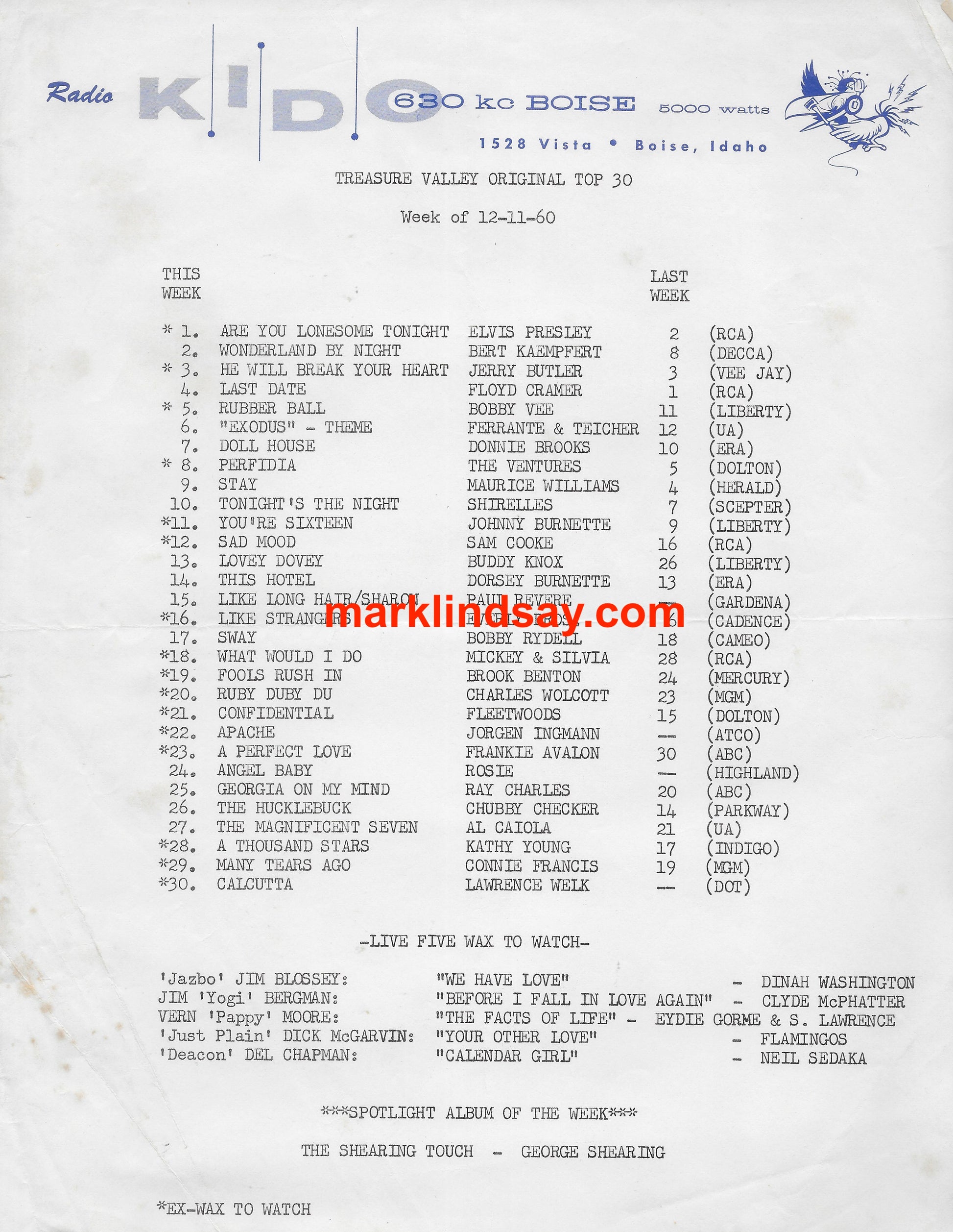 This original 12/11/60 radio survey was given to Mark Lindsay 30+ years ago by the Raiders' original lead guitar player, Bob "Mooney" White. The survey is almost 63 years old. The survey is from Boise's KIDO, and shows Like Long Hair/Sharon at #15, a new entry to the chart. This was the Raiders' second single.