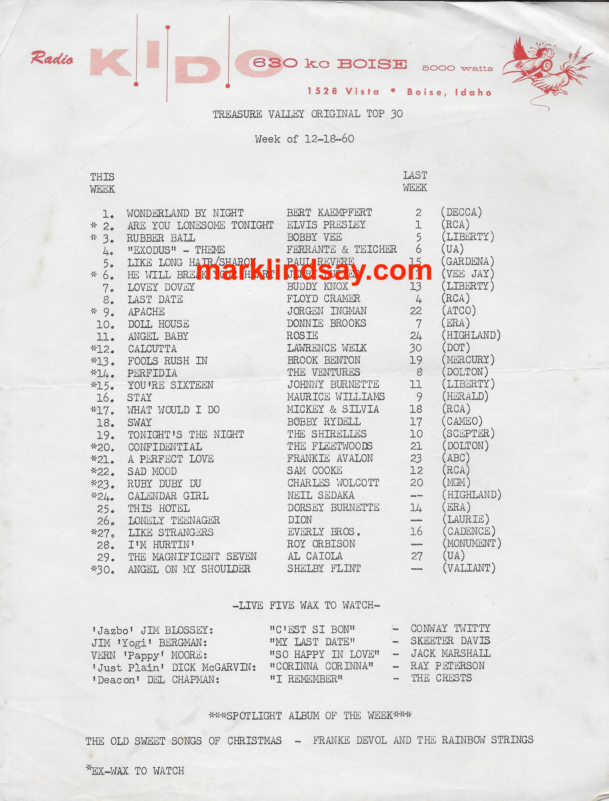 This original 12/18/60 radio survey was given to Mark Lindsay 30+ years ago by the Raiders' original lead guitar player, Bob "Mooney" White. The survey is almost 63 years old. The survey is from Boise's KIDO, and shows Like Long Hair/Sharon at #5, up from #15 the previous week. This was the Raiders' second single.