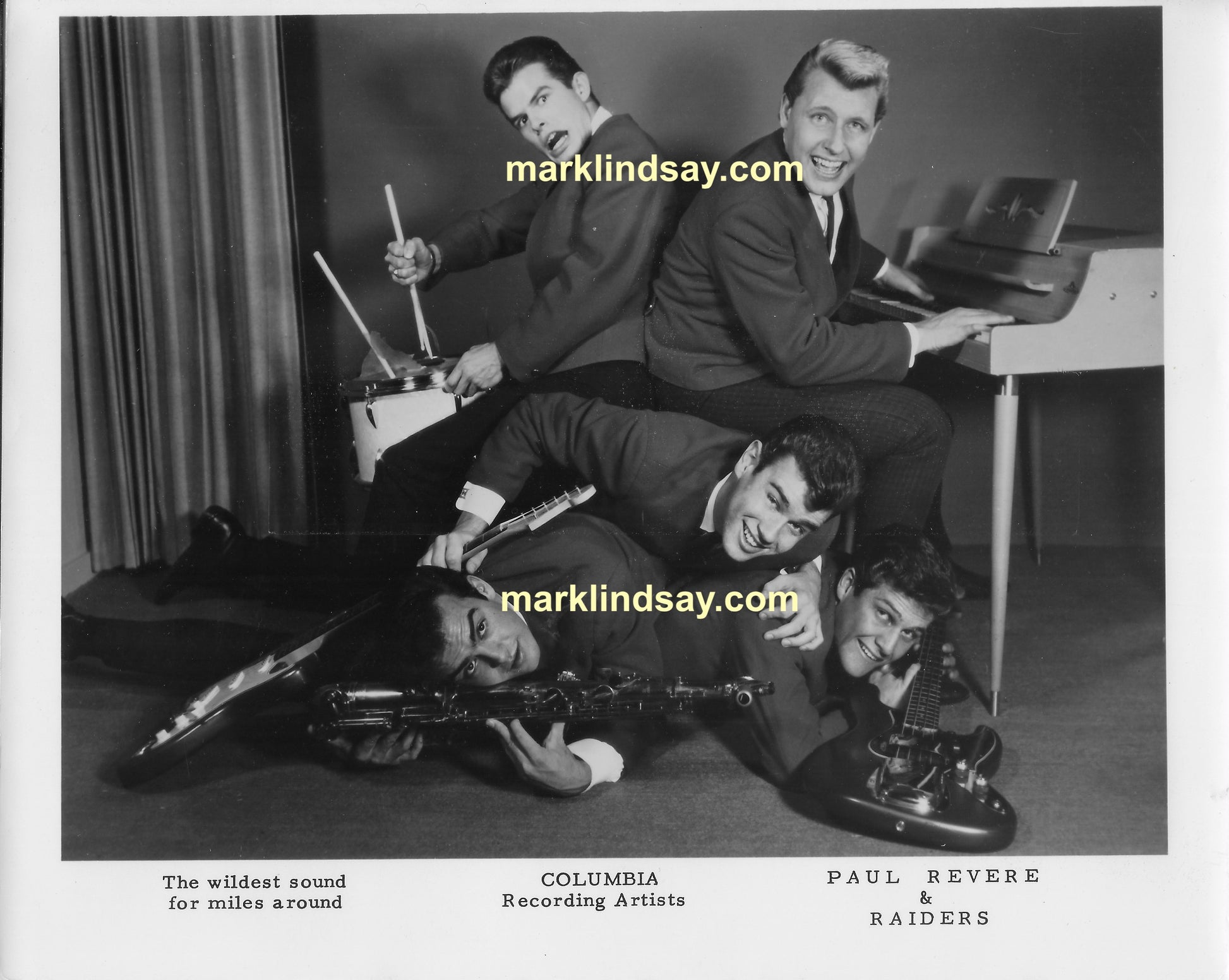 *TWO ONLY* This is an ORIGINAL glossy-finish 8"x10" promo of the Raiders clowning around in late summer 1963, after they were signed to Columbia Records in May. This is a 60-year-old vintage copy printed at that time, not a reproduction. It depicts, from L-R, Mark, Smitty, Drake, Paul, Mark, and Mike Hollladay. They show no agent, manager, or PR person on the promo photo, only the slogan "the wildest sound for miles around" and '"Columbia Recording Artists."
