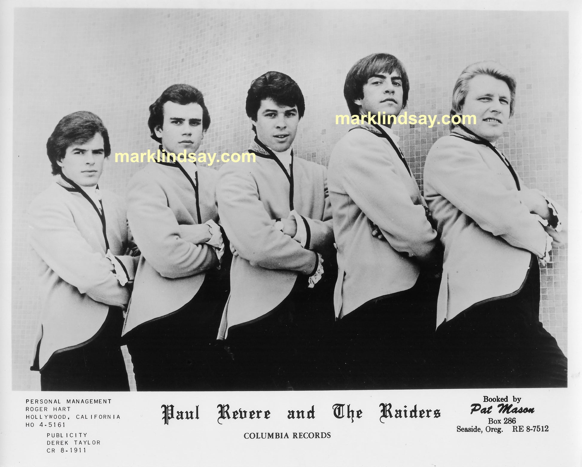 *ALMOST GONE.* This is an ORIGINAL glossy-finish 8"x10" photo of the Raiders in their white collarless jackets in very early 1965. This is one of the vintage copies printed at that time, not a reproduction. It depicts, from L-R, Smitty, Drake, Phil, Mark, and Paul. Pat Mason in Seaside, OR was their agent at the time. Contact info is also given for their manager Roger Hart and PR agent, Derek Taylor, who had just left The Beatles.
