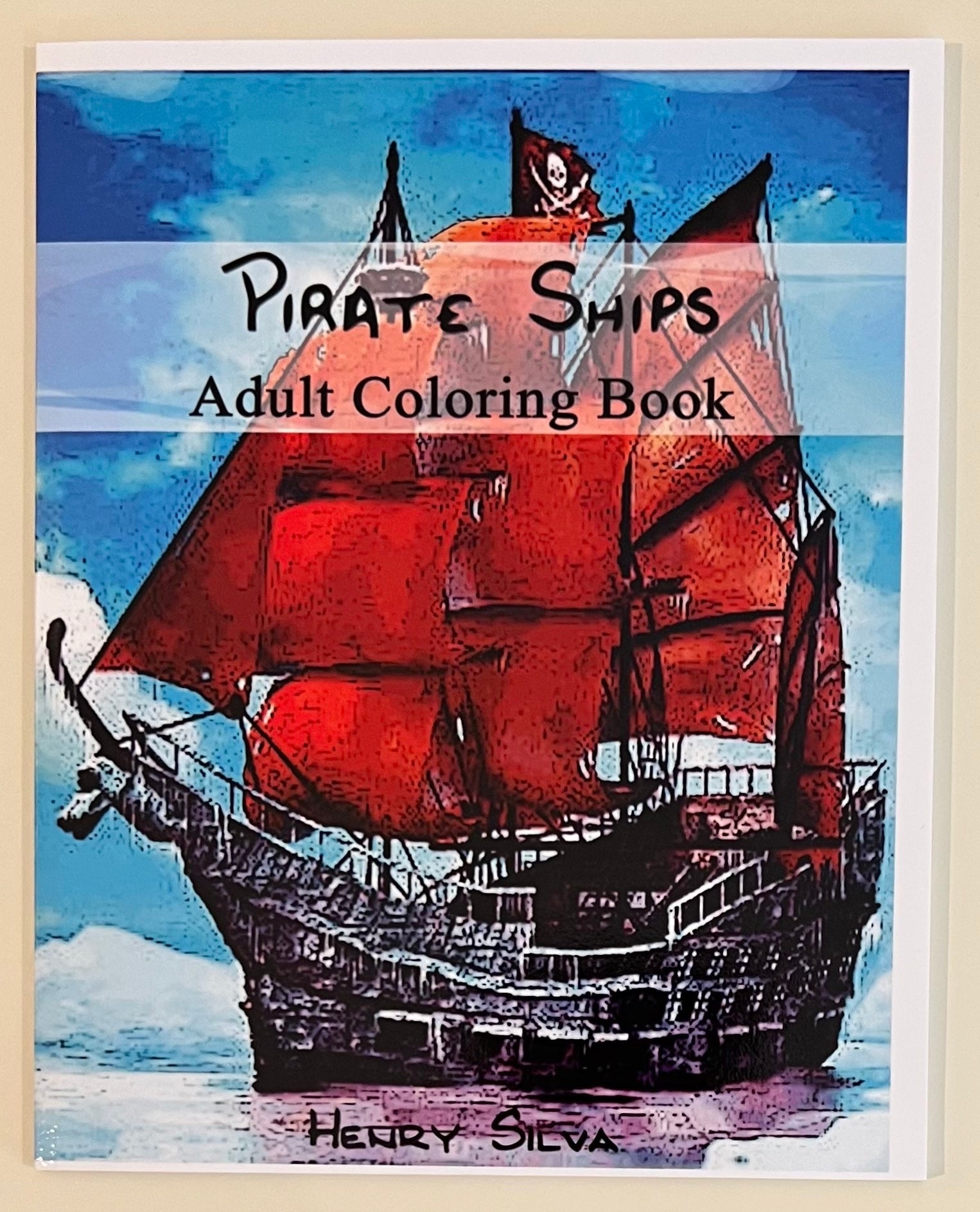 From our shop in Maine, this is an an adult coloring book featuring 39 unique designs of pirate ships. It measures 8" wide and 10" high. Please note that the illustrations are identical to Henry Silva's other coloring book which we have listed as Ships Coloring Book 6, although it has a different cover.